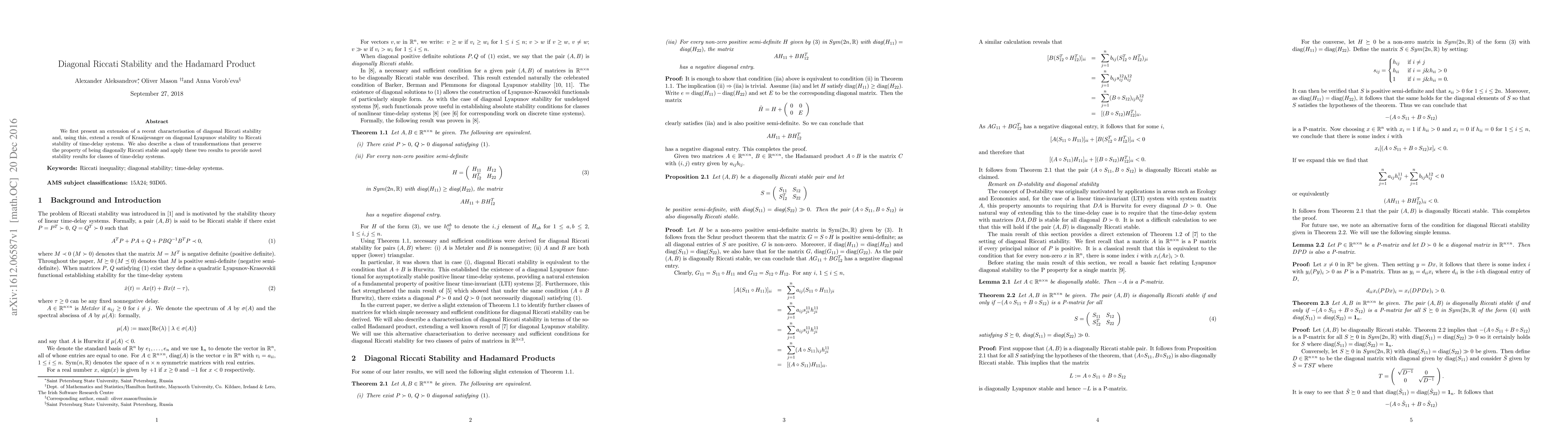 Researchers extend a characterization of diagonal Riccati stability to time-delay systems, providing novel stability results for classes of systems with time delays.