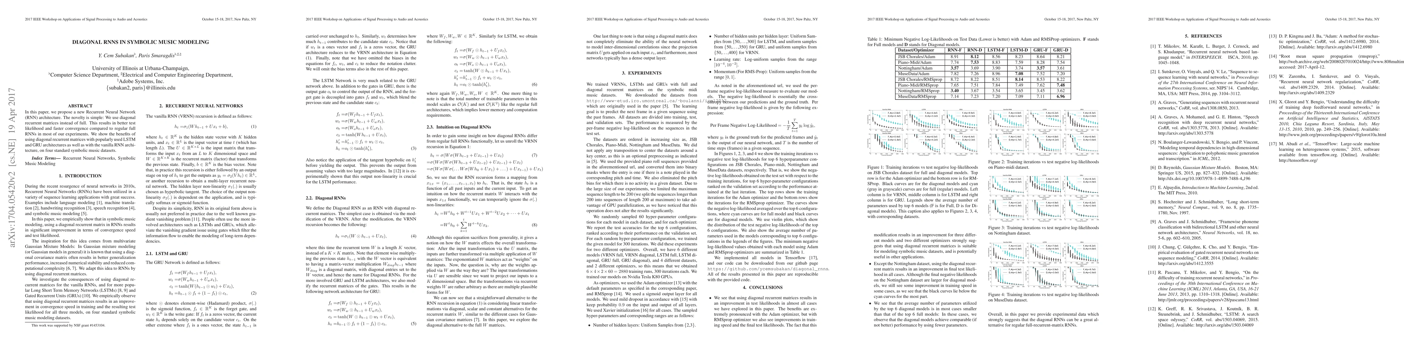 Researchers proposed a new Recurrent Neural Network architecture using diagonal recurrent matrices, which outperformed full RNNs in test likelihood and convergence speed on four music datasets.