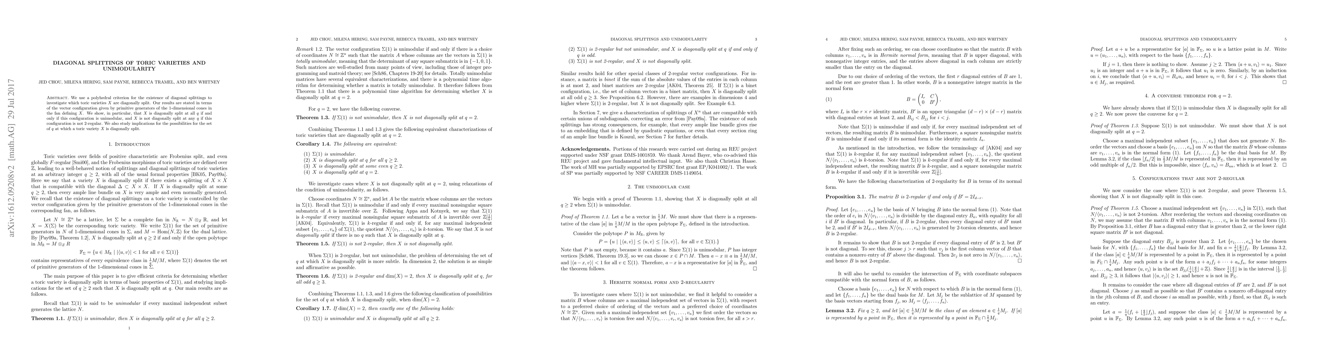 Toric varieties X are diagonally split at q if their vector configuration is unimodular; they are not diagonally split if the configuration is 2-regular.