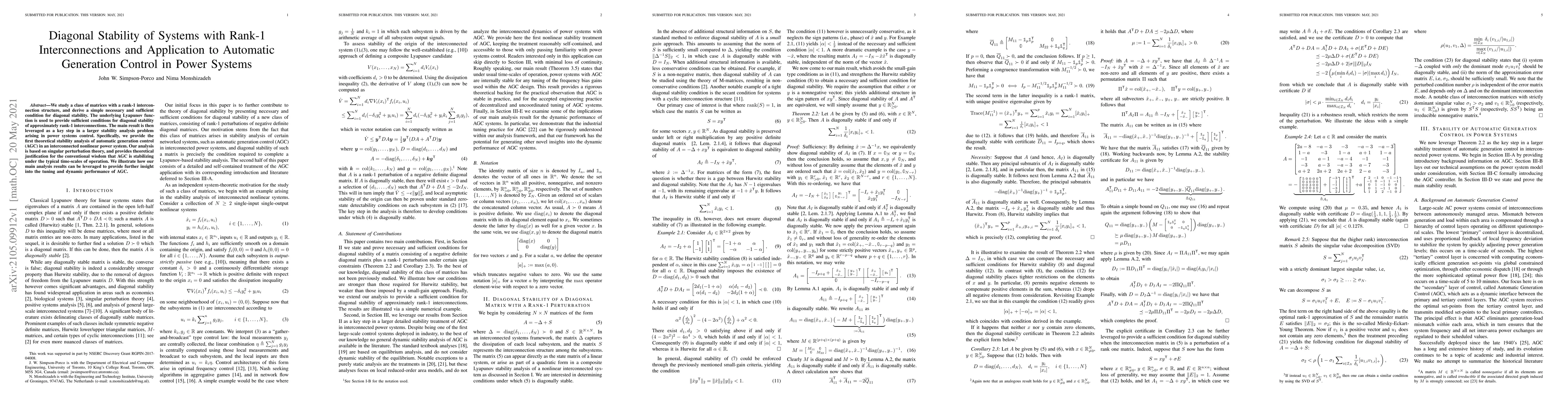 This paper derives a necessary and sufficient condition for diagonal stability in systems with rank-1 interconnections, applying the results to stability analysis for automatic generation control (AGC) in power systems. It provides theoretical justification for AGC's stabilizing effect under typical operational timescales using singular perturbation theory.