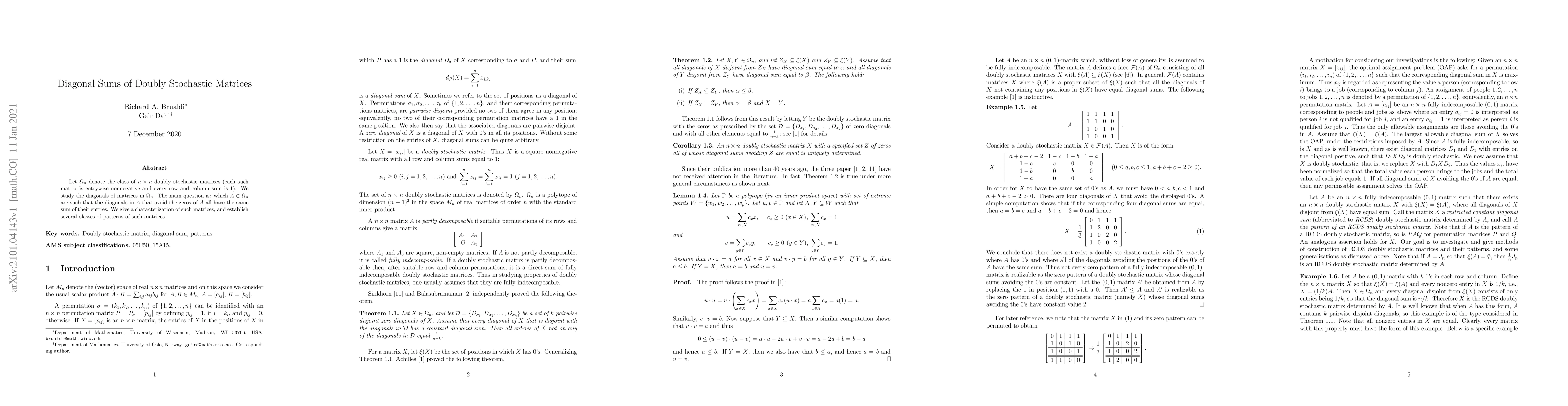 Let $\Omega_n$ denote the class of $n \times n$ doubly stochastic matrices (each such matrix is entrywise nonnegative and every row and column sum is 1). We study the diagonals of matrices in $\Omega_n$. The main question is: which $A \in \Omega_n$ are such that the diagonals in $A$ that avoid the zeros of $A$ all have the same sum of their entries. We give a characterization of such matrices, and establish several classes of patterns of such matrices.