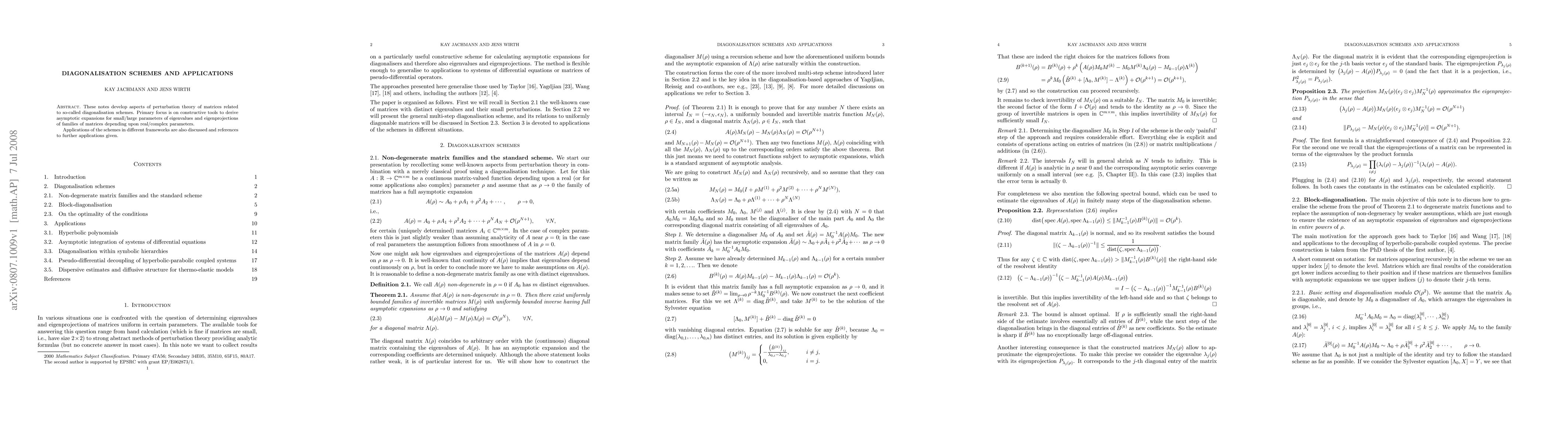 This paper explores perturbation theory for matrices, focusing on diagonalisation schemes to derive asymptotic expansions for eigenvalues and eigenprojections. It also discusses applications in various fields, including hyperbolic polynomials, differential equations, symbolic hierarchies, and coupled systems.
