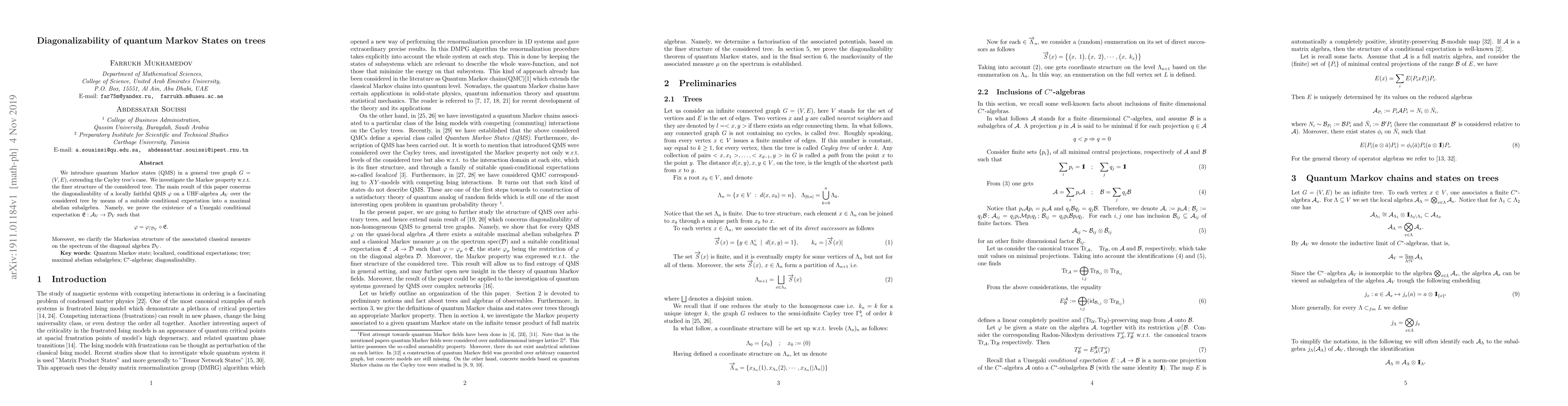 This paper explores quantum Markov states (QMS) on tree graphs, extending beyond the Cayley tree, and proves the diagonalizability of a locally faithful QMS on a UHF-algebra via a Umegaki conditional expectation into a maximal abelian subalgebra. It also elucidates the Markovian structure of the associated classical measure on the spectrum of the diagonal algebra.