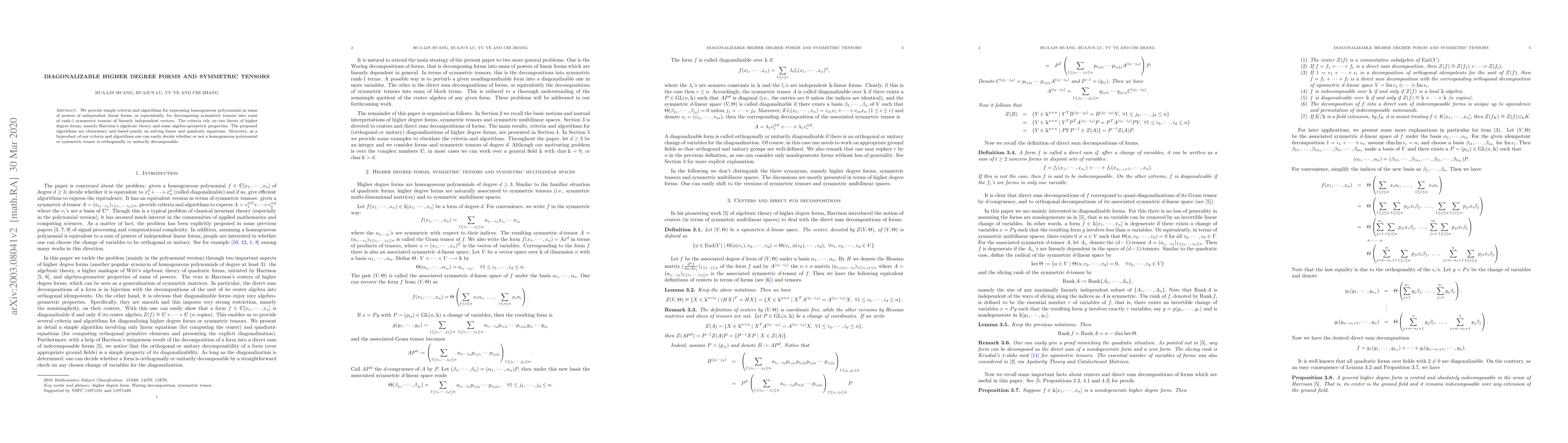 This paper presents straightforward criteria and algorithms for decomposing homogeneous polynomials into sums of powers of independent linear forms using Harrison's algebraic theory and algebro-geometric properties. The algorithms rely on solving linear and quadratic equations and can determine the orthogonal or unitary decomposability of symmetric tensors.