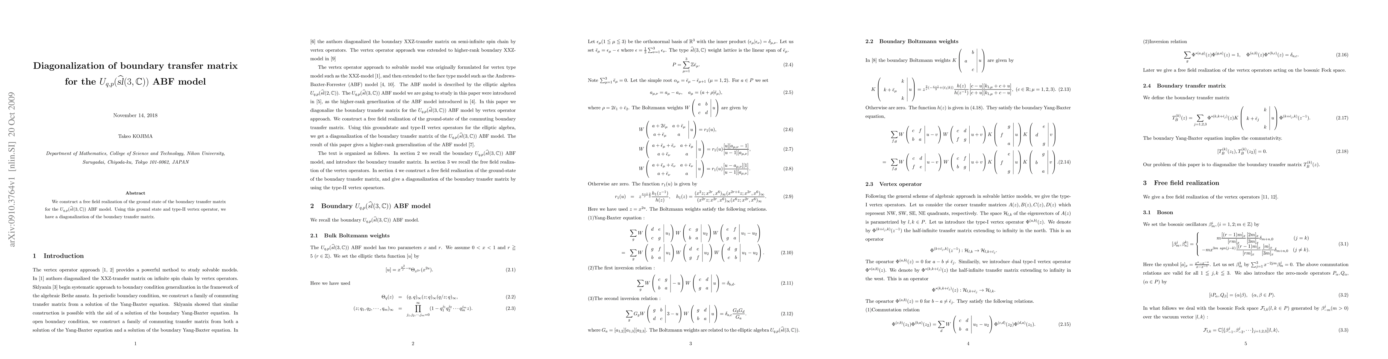 The paper presents a free field realization of the ground state for the boundary transfer matrix of the $U_{q,p}(hat{sl}_3)$ ABF model, enabling its diagonalization using a type-II vertex operator.