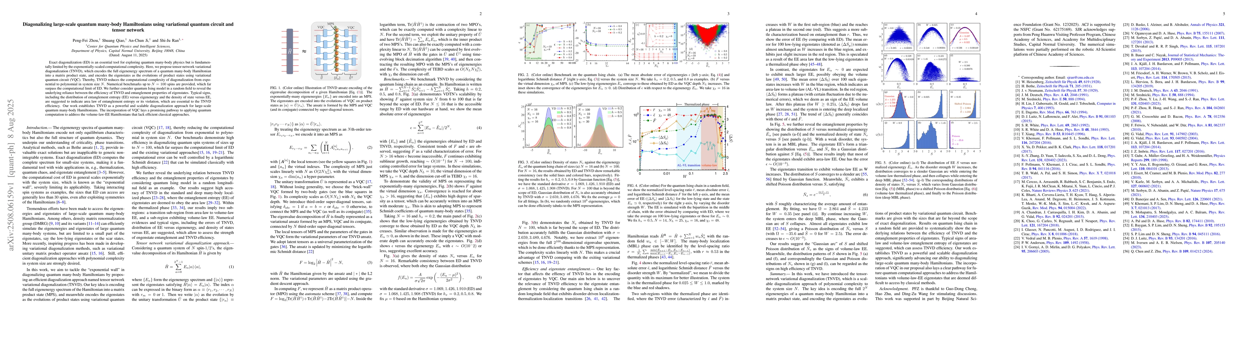The research introduces Tensor Network Variational Diagonalization (TNVD), a method that encodes eigenenergies of quantum many-body Hamiltonians into Matrix Product States (MPS) and eigenstates as the evolutions of product states using Variational Quantum Circuits (VQC).