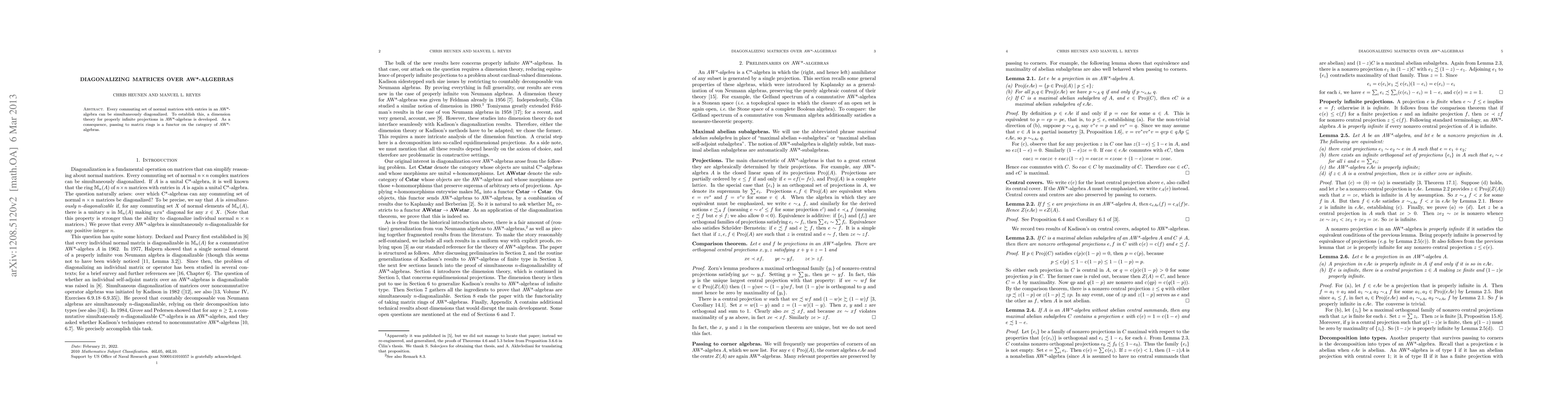 Summary: This paper proves that any commuting set of normal matrices in an AW*-algebra can be simultaneously diagonalized, utilizing a newly developed dimension theory for properly infinite projections. It also demonstrates that passing to matrix rings functions as a functor on the category of AW*-algebras.