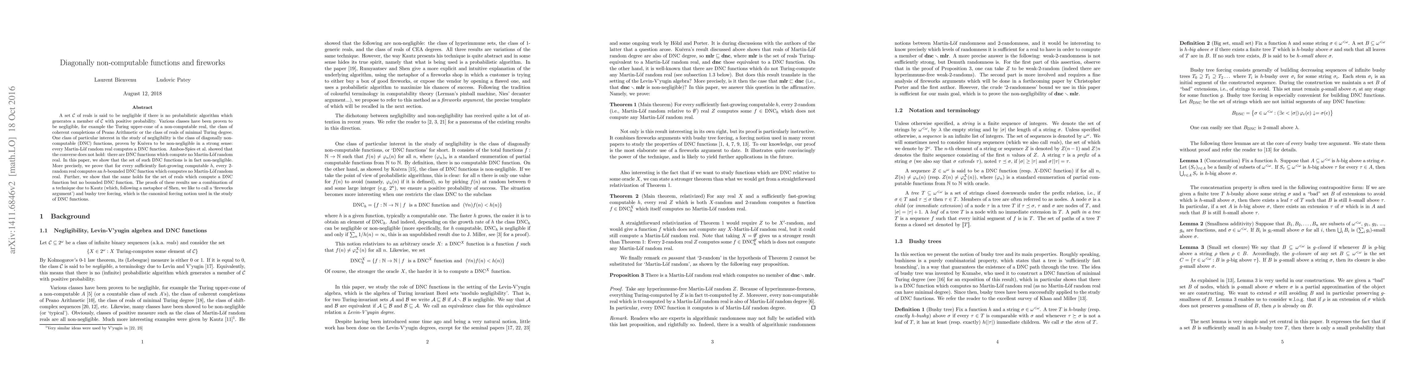 Researchers prove that a specific class of diagonally non-computable (DNC) functions is negligible, meaning no algorithm can compute them with positive probability, and shows every 2-random real computes an h-boundedly DNC function that computes no Martin-Löf random real for sufficiently fast-growing computable h.