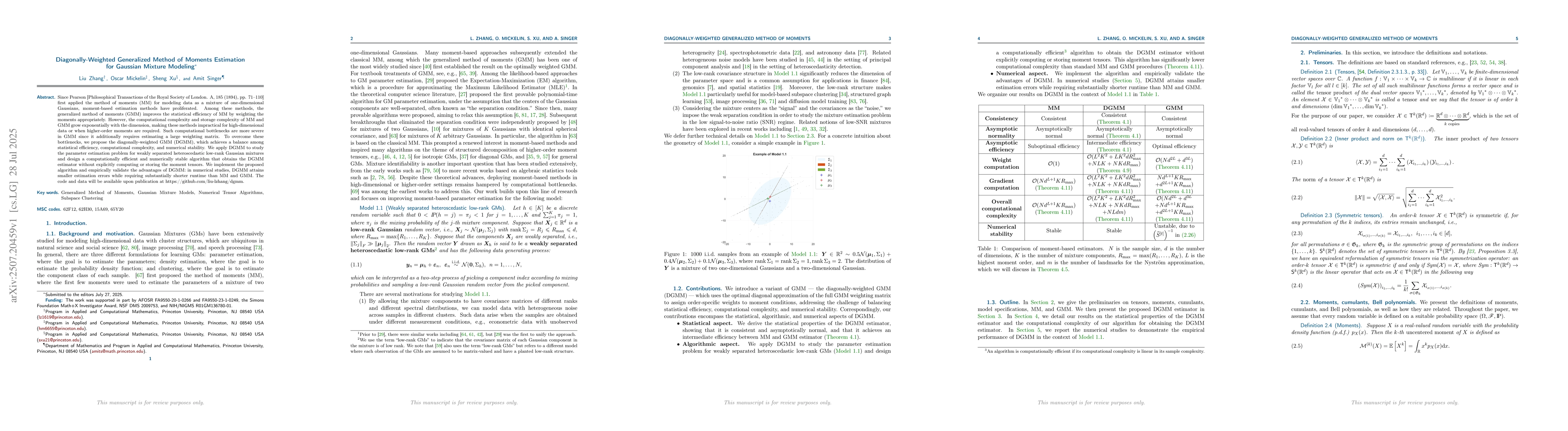 The paper proposes Diagonally-Weighted Generalized Method of Moments (DGMM) for Gaussian Mixture Modeling, aiming to balance statistical efficiency, computational complexity, and numerical stability. It introduces a diagonal weighting matrix to assign less weight to noisier sample moment conditions, thereby improving estimation accuracy.
