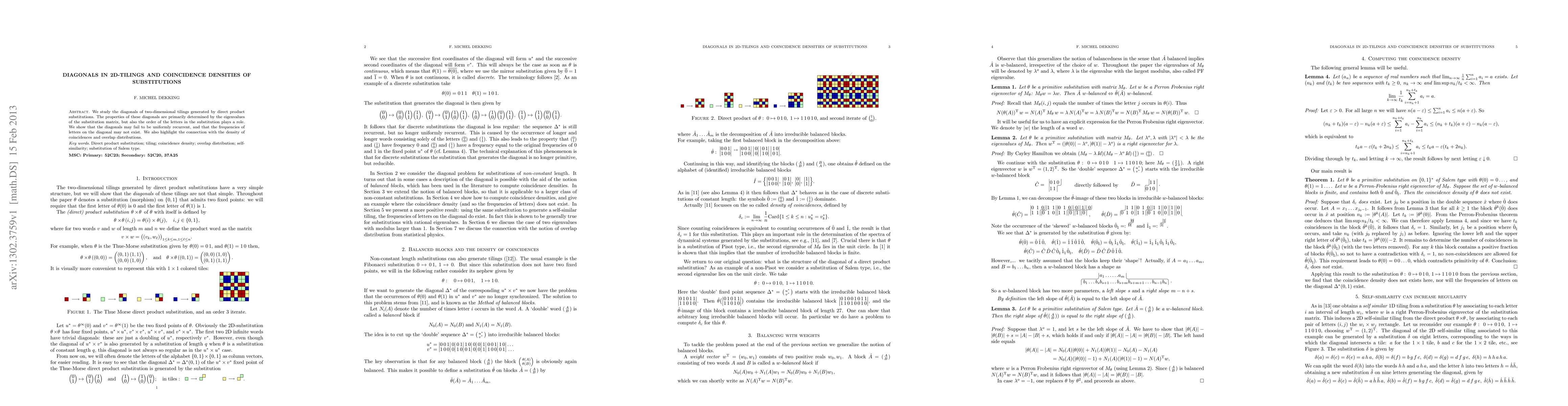 Researchers studied 2D tilings generated by direct product substitutions, finding that diagonals may not be uniformly recurrent and letter frequencies can vary; the study highlights connections to coincidence densities and overlap distributions.
