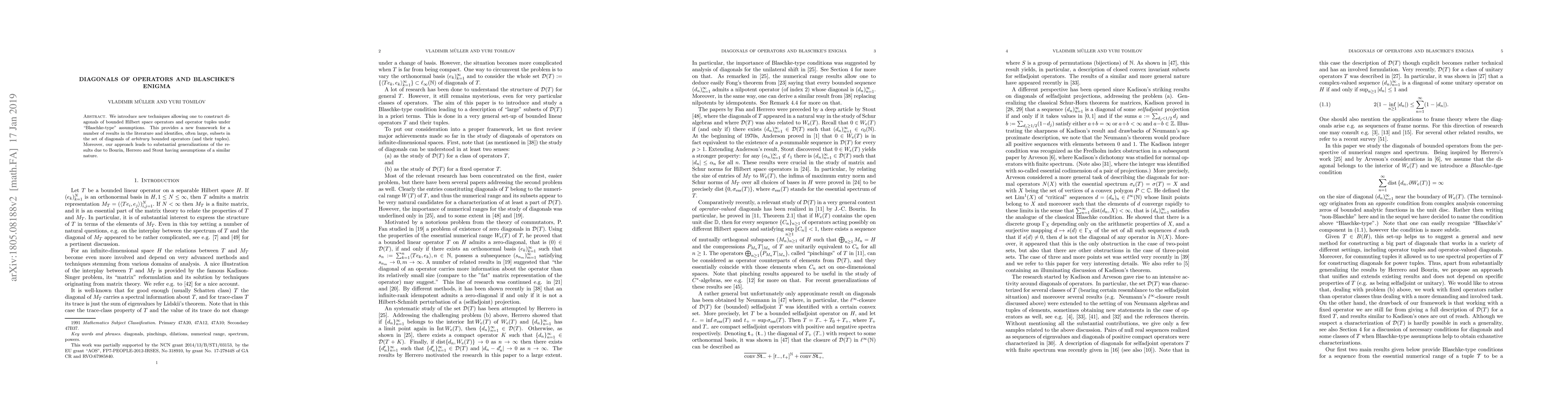 We introduce new techniques allowing one to construct diagonals of bounded Hilbert space operators and operator tuples under "Blaschke-type" assumptions. This provides a new framework for a number of results in the literature and identifies, often large, subsets in the set of diagonals of arbitrary bounded operators (and their tuples). Moreover, our approach leads to substantial generalizations of the results due to Bourin, Herrero and Stout having assumptions of a similar nature.