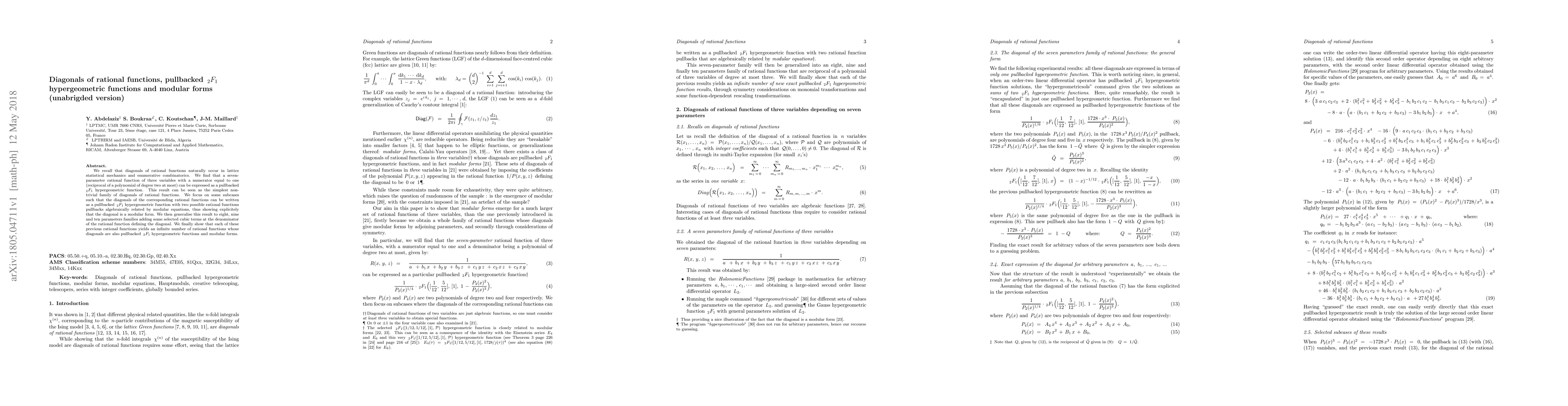 This paper explores diagonals of rational functions in lattice statistical mechanics and enumerative combinatorics, showing that a seven-parameter rational function can be expressed as a pullbacked 2F1 hypergeometric function. It further reveals that diagonals of these functions can be modular forms and generalizes this result to higher parameter families, ultimately demonstrating the existence of an infinite number of such modular forms.