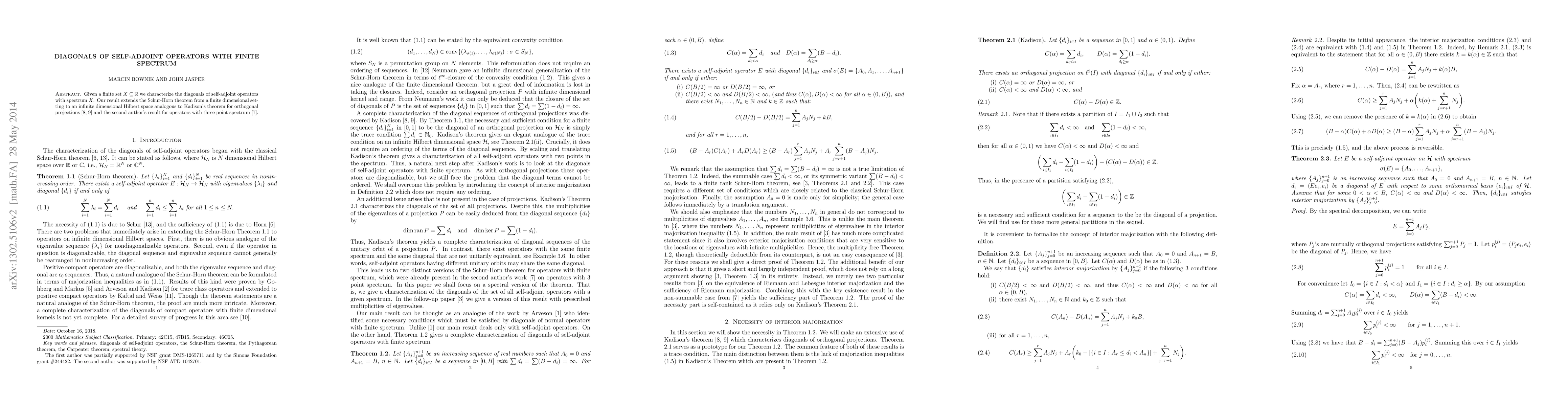 This paper extends the Schur-Horn theorem to infinite-dimensional Hilbert spaces, characterizing the diagonals of self-adjoint operators with a finite spectrum $X \subseteq \mathbb{R}$, similar to Kadison's theorem for orthogonal projections.