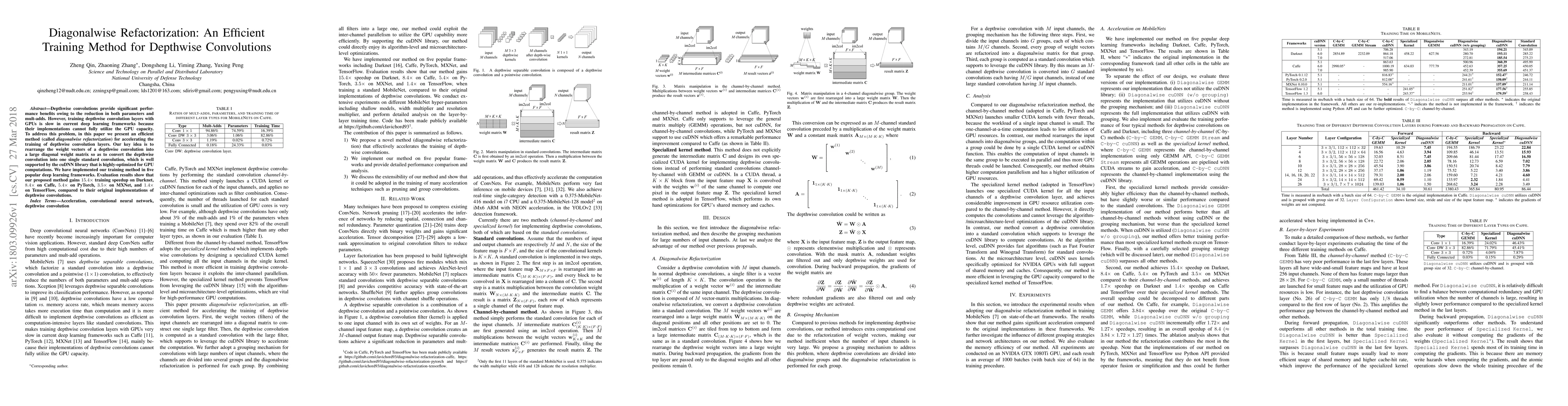 This paper introduces diagonalwise refactorization, a method to accelerate training of depthwise convolutions by converting them into single standard convolutions using GPU-optimized libraries. The approach achieves significant speedups across various deep learning frameworks: 15.4× on Darknet, 8.4× on Caffe, 5.4× on PyTorch, 3.5× on MXNet, and 1.4× on TensorFlow.