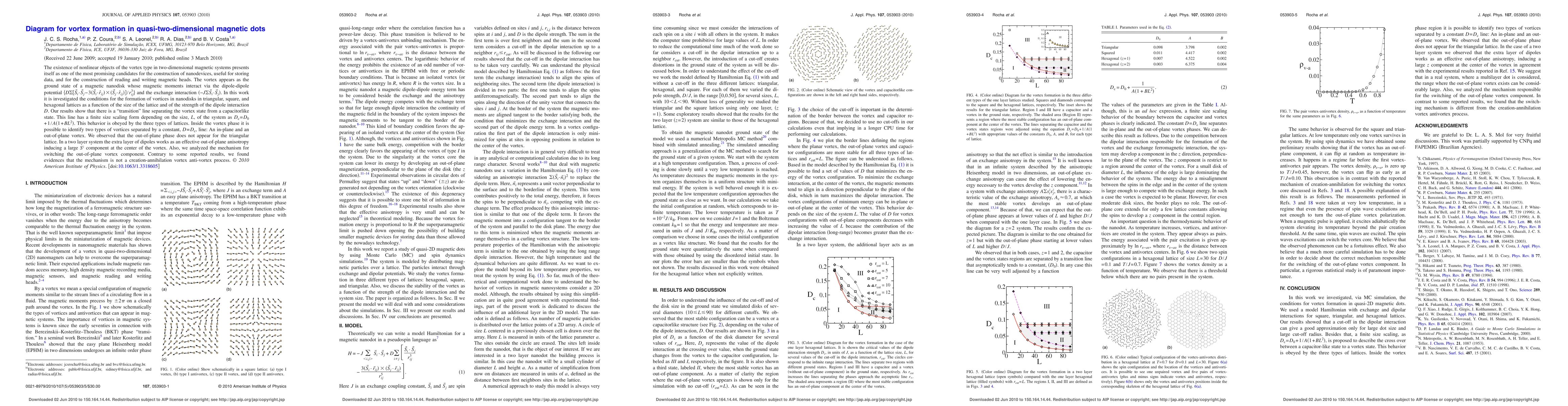 The existence of nonlinear objects of the vortex type in two-dimensional magnetic systems presents itself as one of the most promising candidates for the construction of nanodevices, useful for storing data, and for the construction of reading and writing magnetic heads. The vortex appears as the ground state of a magnetic nanodisk whose magnetic moments interact via dipole-dipole potential?. In this work it is investigated the conditions for the formation of vortices in nanodisks in triangular, square, and hexagonal lattices as a function of the size of the lattice and of the strength of the dipole interaction D. Our results show that there is a "transition" line separating the vortex state from a capacitor like state. This line has a finite size scaling form depending on the size, L, of the system as Dc=D0 +1/A(?1+B*L^2)?. This behavior is obeyed by the three types of lattices. Inside the vortex phase it is possible to identify two types of vortices separated by a constant, D=Dc, line: An in-plane and an out-of-plane vortex. We observed that the out-of-plane phase does not appear for the triangular lattice. In a two layer system the extra layer of dipoles works as an effective out-of-plane anisotropy inducing a large S^z component at the center of the vortex. Also, we analyzed the mechanism for switching the out-of-plane vortex component. Contrary to some reported results, we found evidences that the mechanism is not a creation-annihilation vortex anti-vortex process.