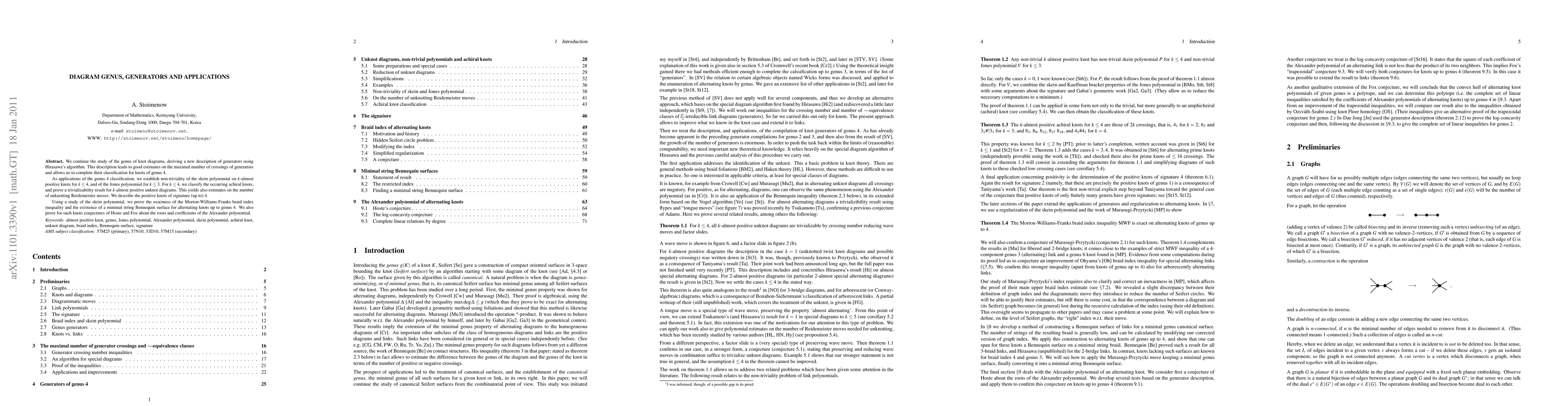 We continue the study of the genus of knot diagrams, deriving a new description of generators using Hirasawa's algorithm. This description leads to good estimates on the maximal number of crossings of generators and allows us to complete their classification for knots of genus 4. As applications of the genus 4 classification, we establish non-triviality of the skein polynomial on $k$-almost positive knots for $k\le 4$, and of the Jones polynomial for $k\le 3$. For $k\le 4$, we classify the occurring achiral knots, and prove a trivializability result for $k$-almost positive unknot diagrams. This yields also estimates on the number of unknotting Reidemeister moves. We describe the positive knots of signature (up to) 4. Using a study of the skein polynomial, we prove the exactness of the Morton-Williams-Franks braid index inequality and the existence of a minimal string Bennequin surface for alternating knots up to genus 4. We also prove for such knots conjectures of Hoste and Fox about the roots and coefficients of the Alexander polynomial.