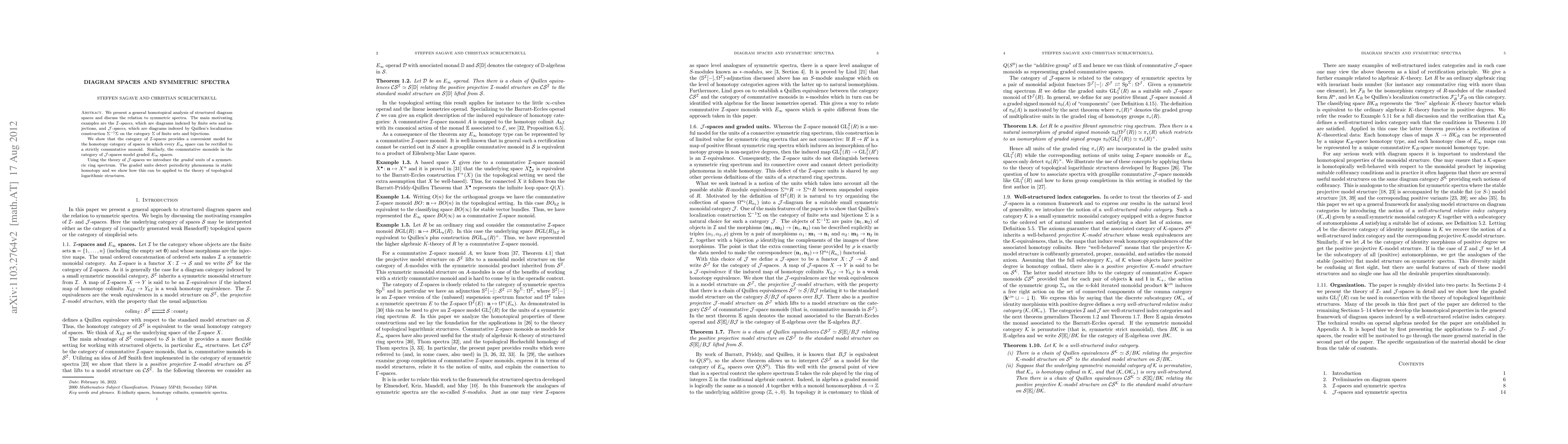 This paper develops a homotopical analysis of structured diagram spaces, specifically I-spaces and J-spaces, which model E-infinity spaces and graded E-infinity spaces, respectively. It introduces the graded units of a symmetric ring spectrum to detect periodicity in stable homotopy theory and applies this to topological logarithmic structures.