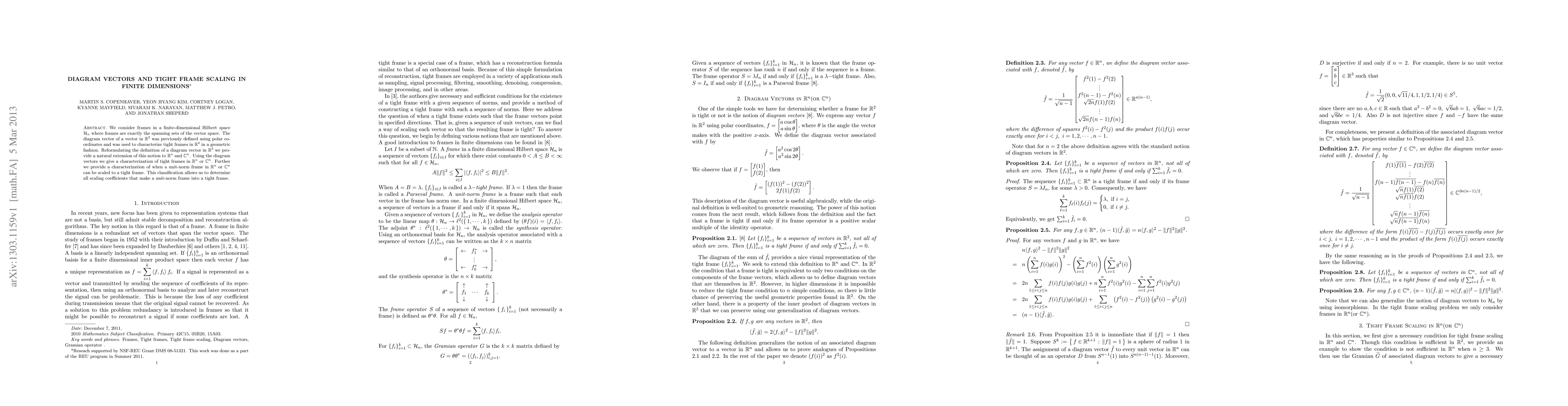 This paper extends the concept of diagram vectors from R2 to Rn and Cn to characterize tight frames in finite-dimensional Hilbert spaces. It also classifies when a unit-norm frame can be scaled to become a tight frame, identifying all scaling coefficients that achieve this transformation.