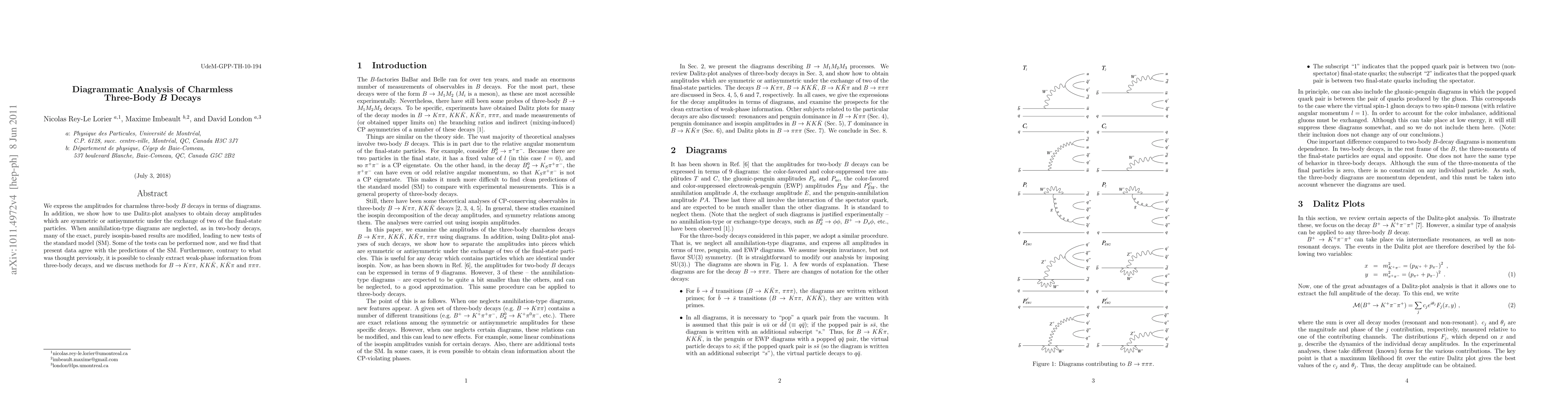 We express the amplitudes for charmless three-body B decays in terms of diagrams. In addition, we show how to use Dalitz-plot analyses to obtain decay amplitudes which are symmetric or antisymmetric under the exchange of two of the final-state particles. When annihilation-type diagrams are neglected, as in two-body decays, many of the exact, purely isospin-based results are modified, leading to new tests of the standard model (SM). Some of the tests can be performed now, and we find that present data agree with the predictions of the SM. Furthermore, contrary to what was thought previously, it is possible to cleanly extract weak-phase information from three-body decays, and we discuss methods for B -> K pi pi, K K Kbar, K Kbar pi and pi pi pi.