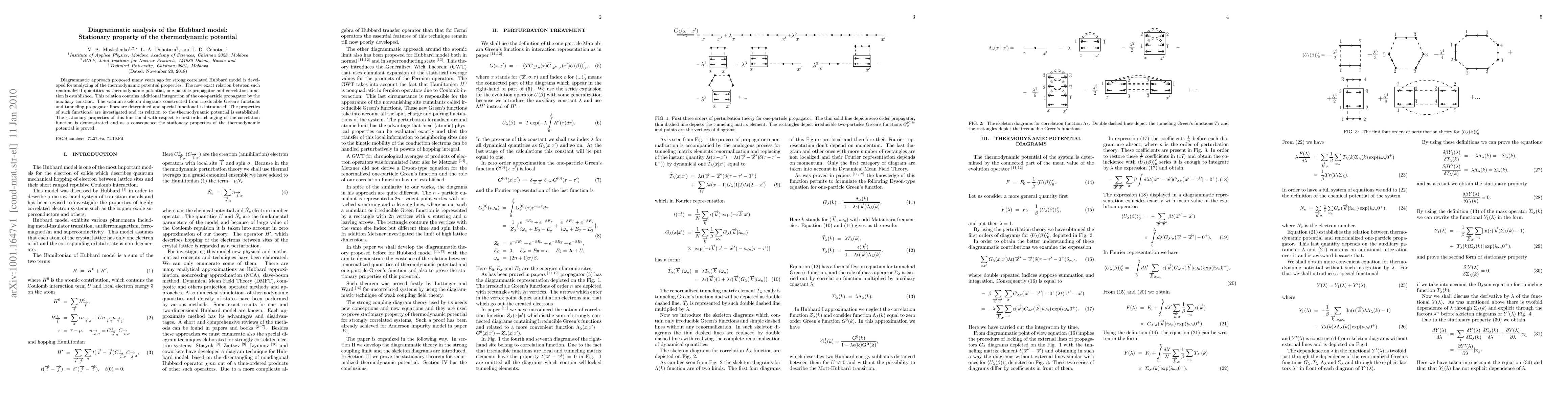 This research paper develops a diagrammatic approach for the Hubbard model to analyze thermodynamic potential properties, establishing a new exact relation involving the thermodynamic potential, one-particle propagator, and correlation function. It introduces a functional whose stationary properties are demonstrated, thereby proving the stationary properties of the thermodynamic potential.