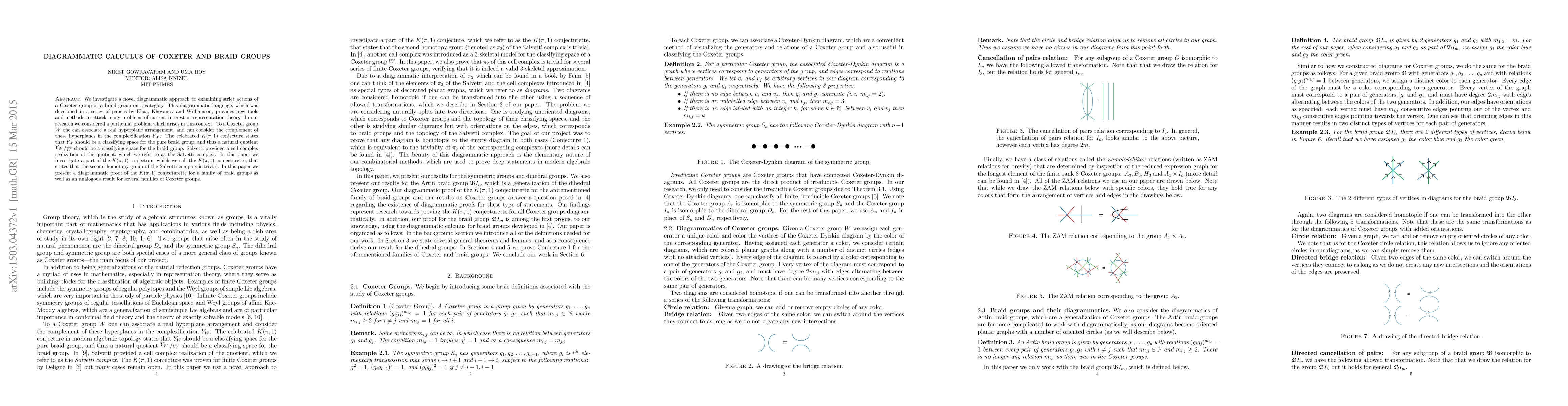 We investigate a novel diagrammatic approach to examining strict actions of a Coxeter group or a braid group on a category. This diagrammatic language, which was developed in a series of papers by Elias, Khovanov and Williamson, provides new tools and methods to attack many problems of current interest in representation theory. In our research we considered a particular problem which arises in this context. To a Coxeter group $W$ one can associate a real hyperplane arrangement, and can consider the complement of these hyperplanes in the complexification $Y_W$. The celebrated $K(\pi,1)$ conjecture states that $Y_W$ should be a classifying space for the pure braid group, and thus a natural quotient ${Y_W}/{W}$ should be a classifying space for the braid group. Salvetti provided a cell complex realization of the quotient, which we refer to as the Salvetti complex. In this paper we investigate a part of the $K(\pi,1)$ conjecture, which we call the $K(\pi,1)$ conjecturette, that states that the second homotopy group of the Salvetti complex is trivial. In this paper we present a diagrammatic proof of the $K(\pi,1)$ conjecturette for a family of braid groups as well as an analogous result for several families of Coxeter groups.