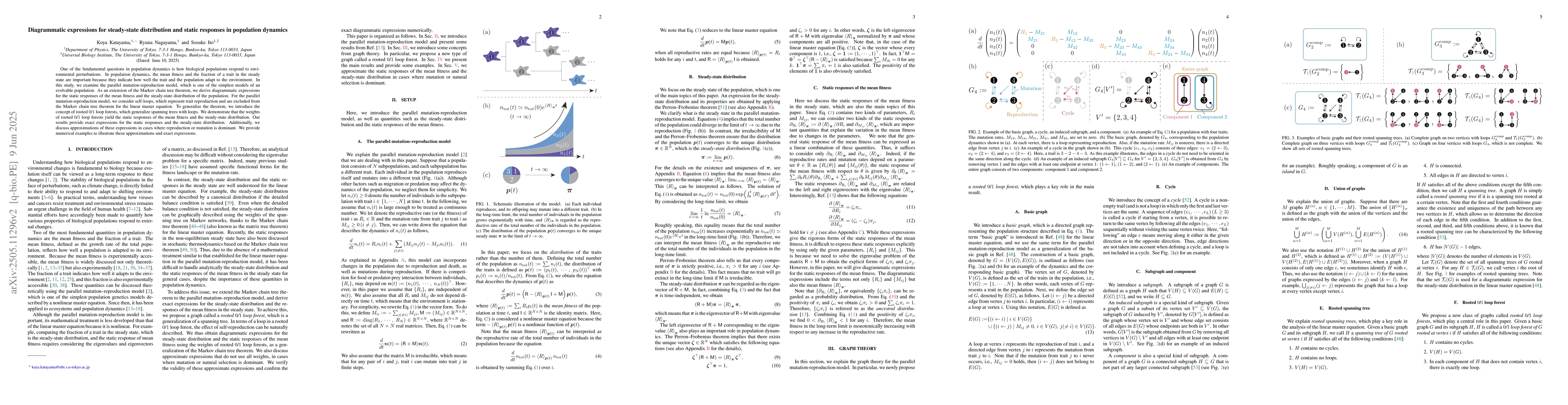 The study extends the Markov chain tree theorem to derive diagrammatic expressions for static responses of mean fitness and steady-state distribution in the parallel mutation-reproduction model using rooted 0/1 loop forests.