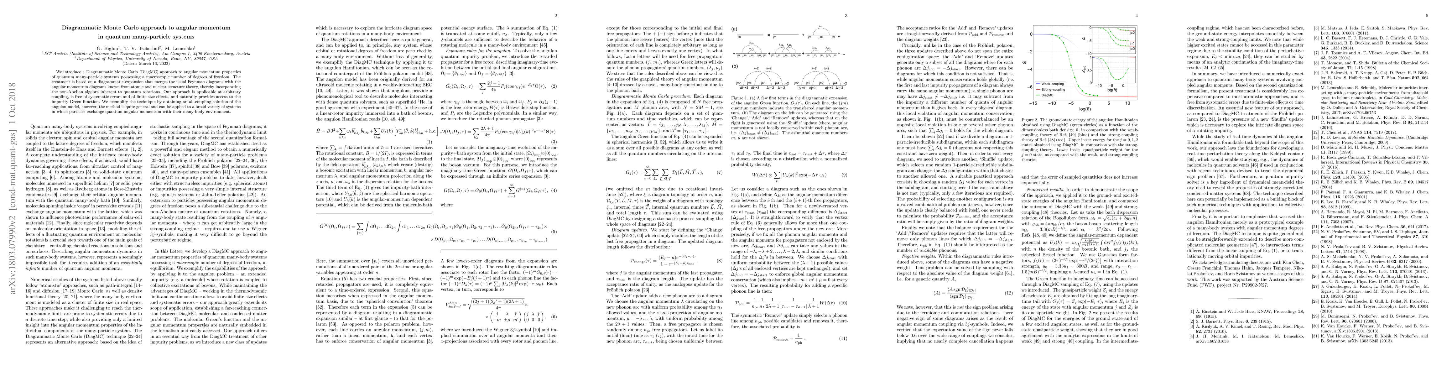 The paper introduces a Diagrammatic Monte Carlo (DiagMC) approach for studying angular momentum in quantum many-particle systems, merging Feynman diagrams with angular momentum diagrams to handle non-Abelian rotations. The method is applicable at all coupling strengths, free of systematic errors, and provides insights into impurity Green functions.