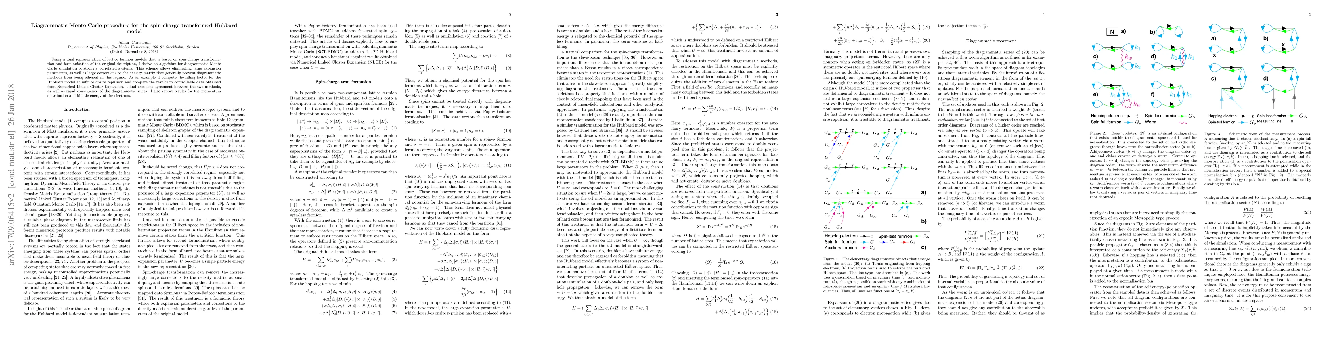 The paper presents a novel diagrammatic Monte Carlo algorithm for the spin-charge transformed Hubbard model, achieving efficient simulation by eliminating large expansion parameters. The method shows excellent agreement with Numerical Linked Cluster Expansion results for the filling factor, momentum distribution, and kinetic energy.