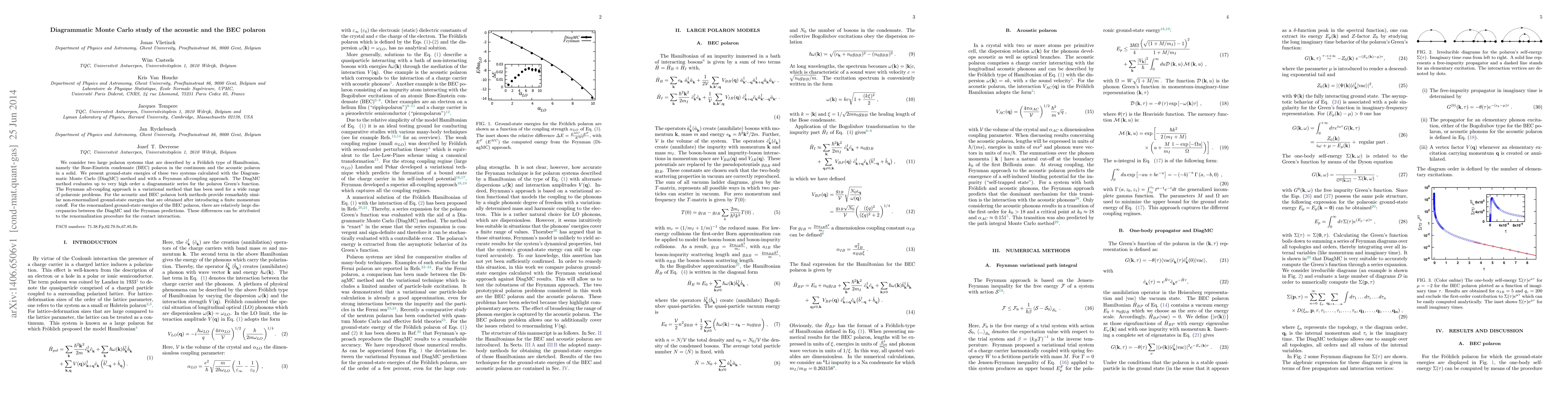 This paper employs Diagrammatic Monte Carlo (DiagMC) and Feynman all-coupling methods to calculate ground-state energies for acoustic and BEC polarons, finding similar results for non-renormalized energies but significant discrepancies for renormalized BEC polaron energies due to differing renormalization approaches.