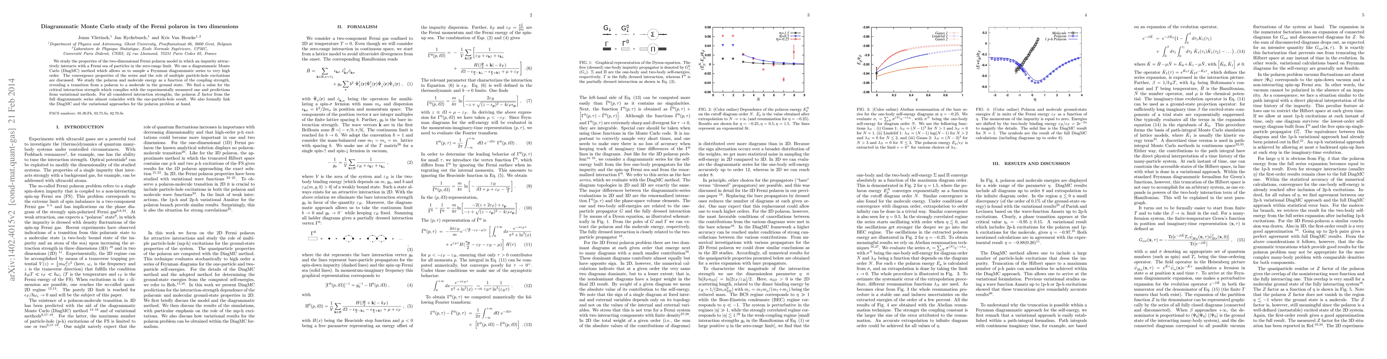 This paper employs a diagrammatic Monte Carlo method to study the two-dimensional Fermi polaron model, revealing a transition from polaron to molecule states with increasing interaction strength. The study finds a critical interaction strength matching experimental and variational predictions, and shows that the polaron's $Z$ factor aligns closely with one-particle-hole excitation results.