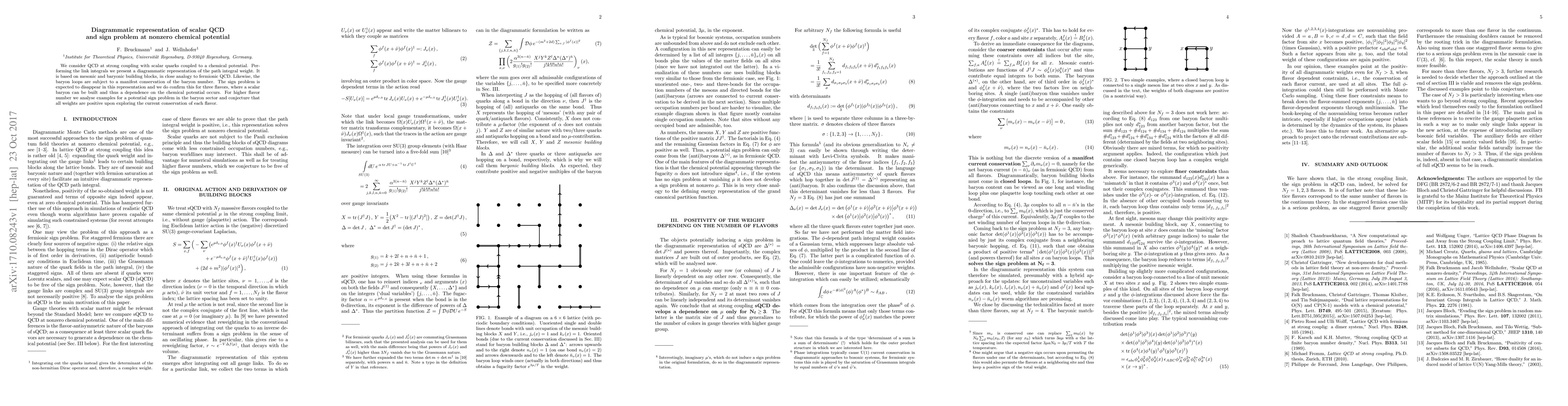 We consider QCD at strong coupling with scalar quarks coupled to a chemical potential. Performing the link integrals we present a diagrammatic representation of the path integral weight. It is based on mesonic and baryonic building blocks, in close analogy to fermionic QCD. Likewise, the baryon loops are subject to a manifest conservation of the baryon number. The sign problem is expected to disappear in this representation and we do confirm this for three flavors, where a scalar baryon can be built and thus a dependence on the chemical potential occurs. For higher flavor number we analyse examples for a potential sign problem in the baryon sector and conjecture that all weights are positive upon exploring the current conservation of each flavor.