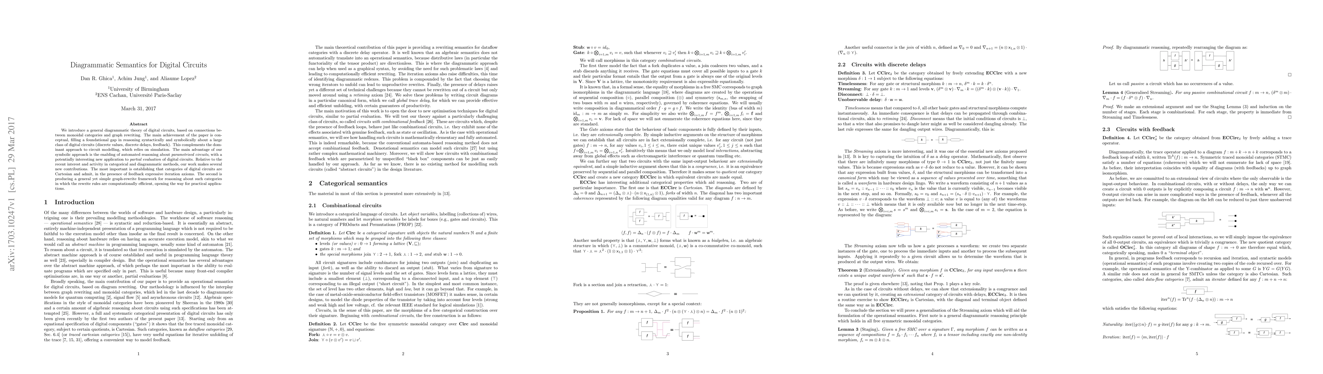 This paper develops a diagrammatic theory for digital circuits using monoidal categories and graph rewriting, providing a foundational framework for syntactic and symbolic reasoning about a wide range of circuits. It introduces a computationally efficient graph-rewrite system, enabling automated reasoning and potential applications in partial evaluation, complementing traditional simulation-based approaches.