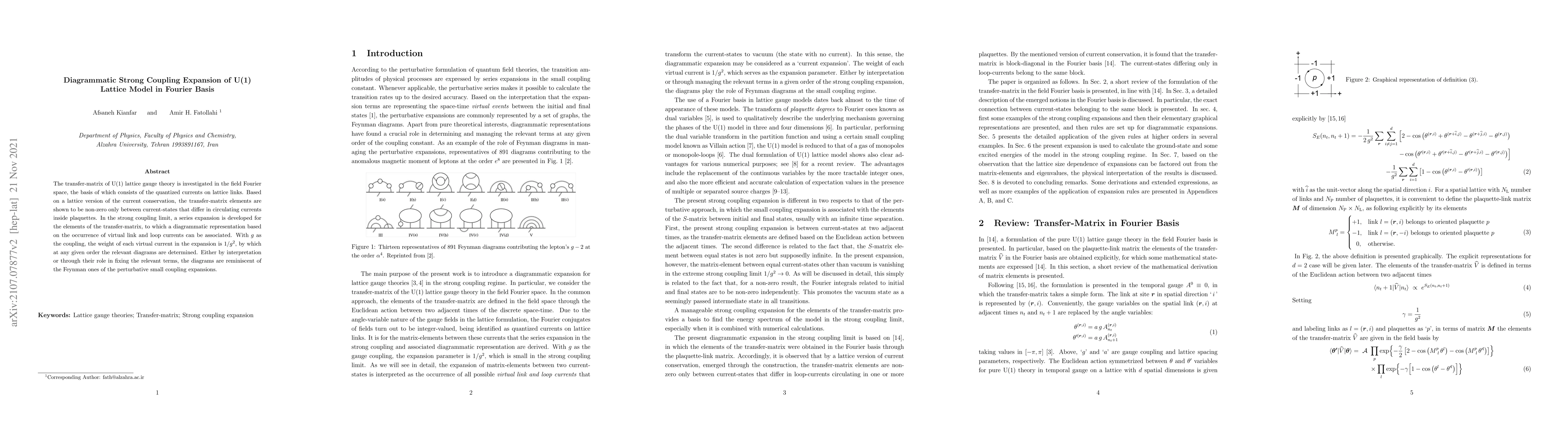 The transfer-matrix of U(1) lattice gauge theory is investigated in the field Fourier space, the basis of which consists of the quantized currents on lattice links. Based on a lattice version of the current conservation, the transfer-matrix elements are shown to be non-zero only between current-states that differ in circulating currents inside plaquettes. In the strong coupling limit, a series expansion is developed for the elements of the transfer-matrix, to which a diagrammatic representation based on the occurrence of virtual link and loop currents can be associated. With $g$ as the coupling, the weight of each virtual current in the expansion is $1/g^2$, by which at any given order the relevant diagrams are determined. Either by interpretation or through their role in fixing the relevant terms, the diagrams are reminiscent of the Feynman ones of the perturbative small coupling expansions.