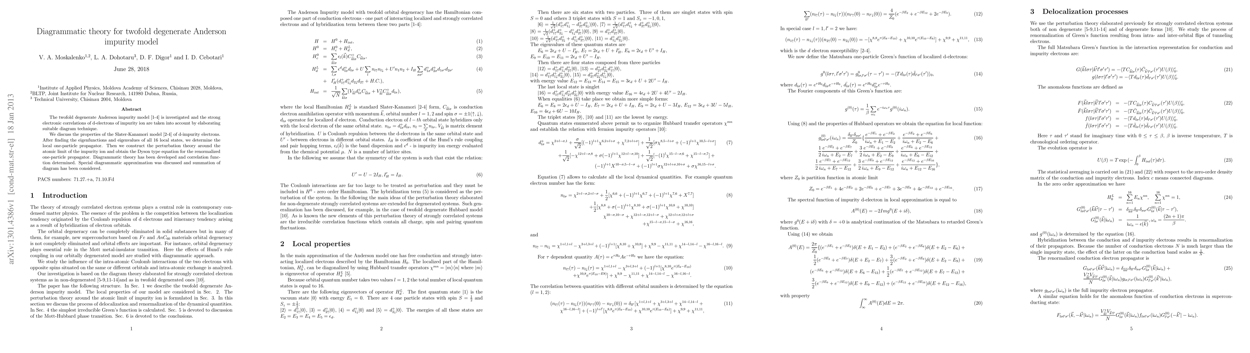 This paper develops a diagrammatic theory for the twofold degenerate Anderson impurity model, focusing on strong electronic correlations of d-electrons. It determines the local one-particle propagator and constructs a Dyson-type equation, while discussing special diagrammatic approximations and the summation of diagrams.