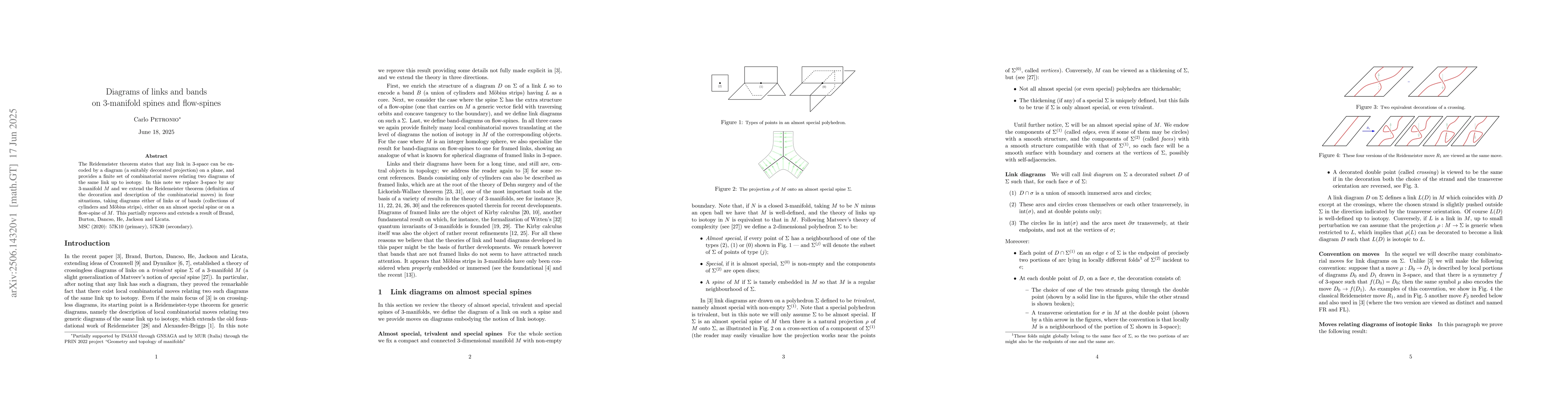The Reidemeister theorem states that any link in $3$-space can be encoded by a diagram (a suitably decorated projection) on a plane, and provides a finite set of combinatorial moves relating two diagrams of the same link up to isotopy. In this note we replace $3$-space by any 3-manifold $M$ and we extend the Reidemeister theorem (definition of the decoration and description of the combinatorial moves) in four situations, taking diagrams either of links or of bands (collections of cylinders and M\"obius strips), either on an almost special spine or on a flow-spine of $M$. This partially reproves and extends a result of Brand, Burton, Dancso, He, Jackson and Licata.