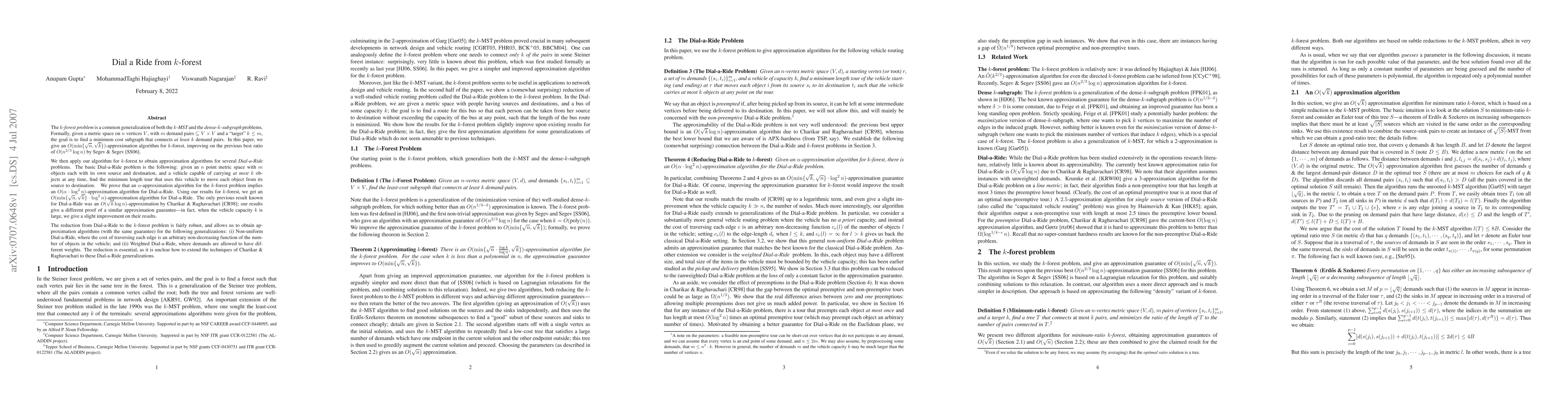 The k-forest problem is a common generalization of both the k-MST and the dense-$k$-subgraph problems. Formally, given a metric space on $n$ vertices $V$, with $m$ demand pairs $\subseteq V \times V$ and a ``target'' $k\le m$, the goal is to find a minimum cost subgraph that connects at least $k$ demand pairs. In this paper, we give an $O(\min\{\sqrt{n},\sqrt{k}\})$-approximation algorithm for $k$-forest, improving on the previous best ratio of $O(n^{2/3}\log n)$ by Segev & Segev. We then apply our algorithm for k-forest to obtain approximation algorithms for several Dial-a-Ride problems. The basic Dial-a-Ride problem is the following: given an $n$ point metric space with $m$ objects each with its own source and destination, and a vehicle capable of carrying at most $k$ objects at any time, find the minimum length tour that uses this vehicle to move each object from its source to destination. We prove that an $\alpha$-approximation algorithm for the $k$-forest problem implies an $O(\alpha\cdot\log^2n)$-approximation algorithm for Dial-a-Ride. Using our results for $k$-forest, we get an $O(\min\{\sqrt{n},\sqrt{k}\}\cdot\log^2 n)$- approximation algorithm for Dial-a-Ride. The only previous result known for Dial-a-Ride was an $O(\sqrt{k}\log n)$-approximation by Charikar & Raghavachari; our results give a different proof of a similar approximation guarantee--in fact, when the vehicle capacity $k$ is large, we give a slight improvement on their results.