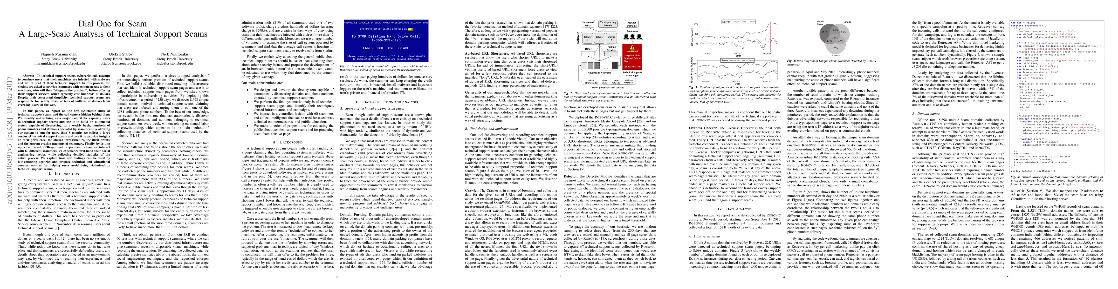 This paper conducts a large-scale analysis of technical support scams, identifying malvertising as a primary vector and developing an automated system to uncover scam call centers. The findings highlight scam prevalence, infrastructure, and evasion tactics, and propose countermeasures to protect users.