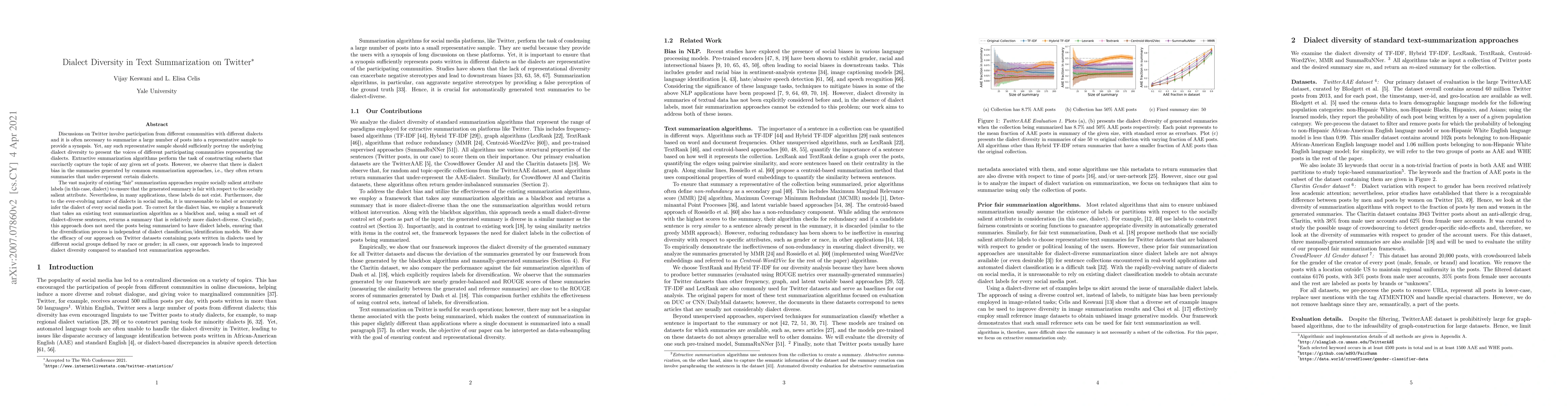 This research paper proposes a framework to improve dialect diversity in text summarization on Twitter by using dialect-diverse sentences without requiring social media posts to have dialect labels.