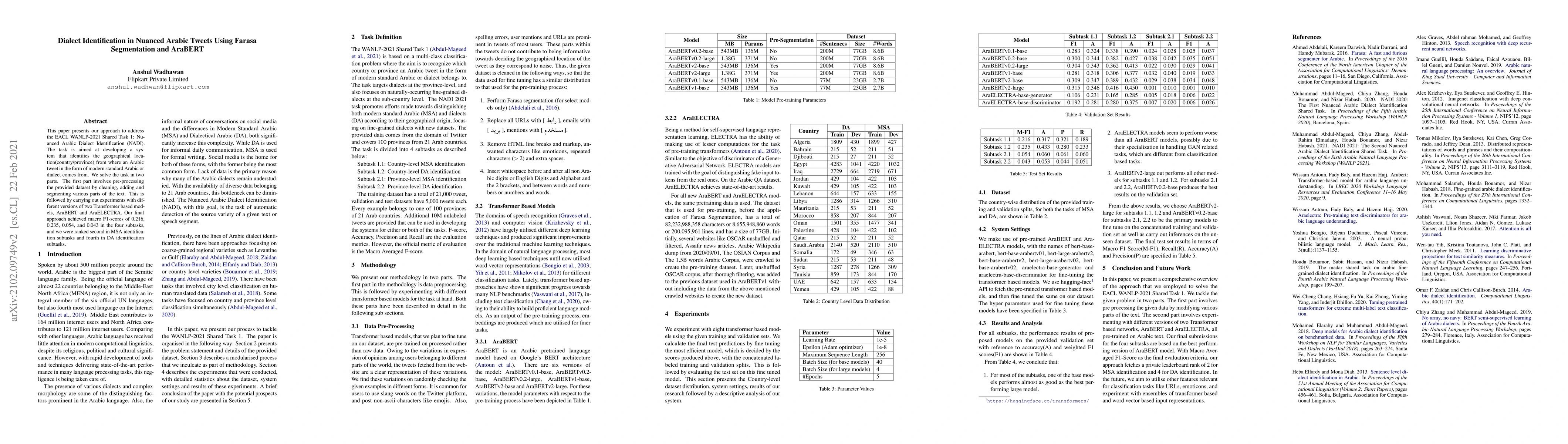 This paper presents our approach to address the EACL WANLP-2021 Shared Task 1: Nuanced Arabic Dialect Identification (NADI). The task is aimed at developing a system that identifies the geographical location(country/province) from where an Arabic tweet in the form of modern standard Arabic or dialect comes from. We solve the task in two parts. The first part involves pre-processing the provided dataset by cleaning, adding and segmenting various parts of the text. This is followed by carrying out experiments with different versions of two Transformer based models, AraBERT and AraELECTRA. Our final approach achieved macro F1-scores of 0.216, 0.235, 0.054, and 0.043 in the four subtasks, and we were ranked second in MSA identification subtasks and fourth in DA identification subtasks.