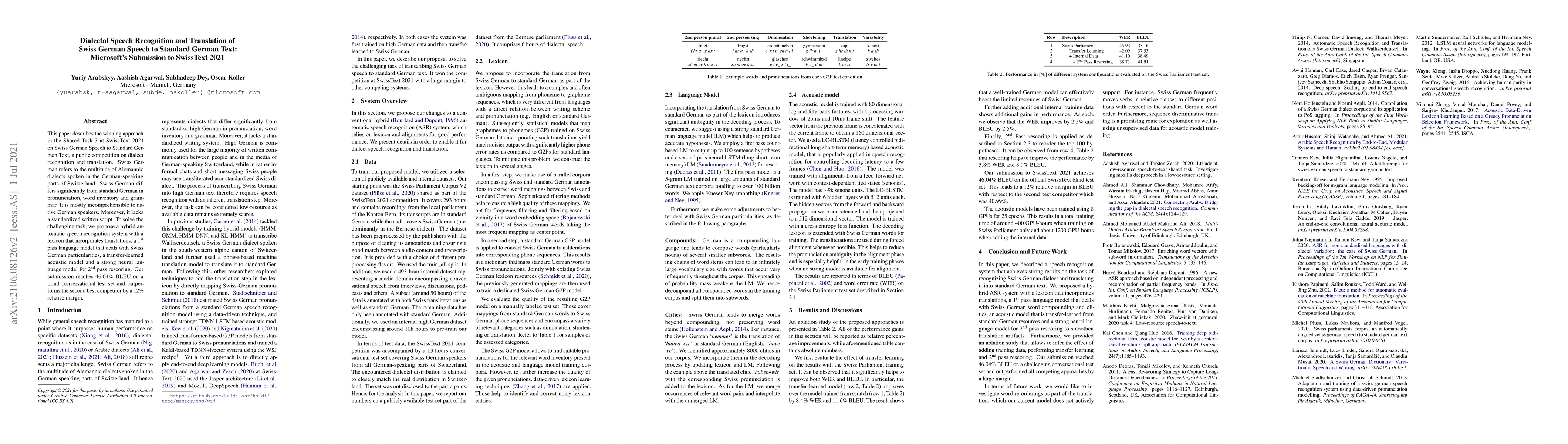This paper describes the winning approach in the Shared Task 3 at SwissText 2021 on Swiss German Speech to Standard German Text, a public competition on dialect recognition and translation. Swiss German refers to the multitude of Alemannic dialects spoken in the German-speaking parts of Switzerland. Swiss German differs significantly from standard German in pronunciation, word inventory and grammar. It is mostly incomprehensible to native German speakers. Moreover, it lacks a standardized written script. To solve the challenging task, we propose a hybrid automatic speech recognition system with a lexicon that incorporates translations, a 1st pass language model that deals with Swiss German particularities, a transfer-learned acoustic model and a strong neural language model for 2nd pass rescoring. Our submission reaches 46.04% BLEU on a blind conversational test set and outperforms the second best competitor by a 12% relative margin.
