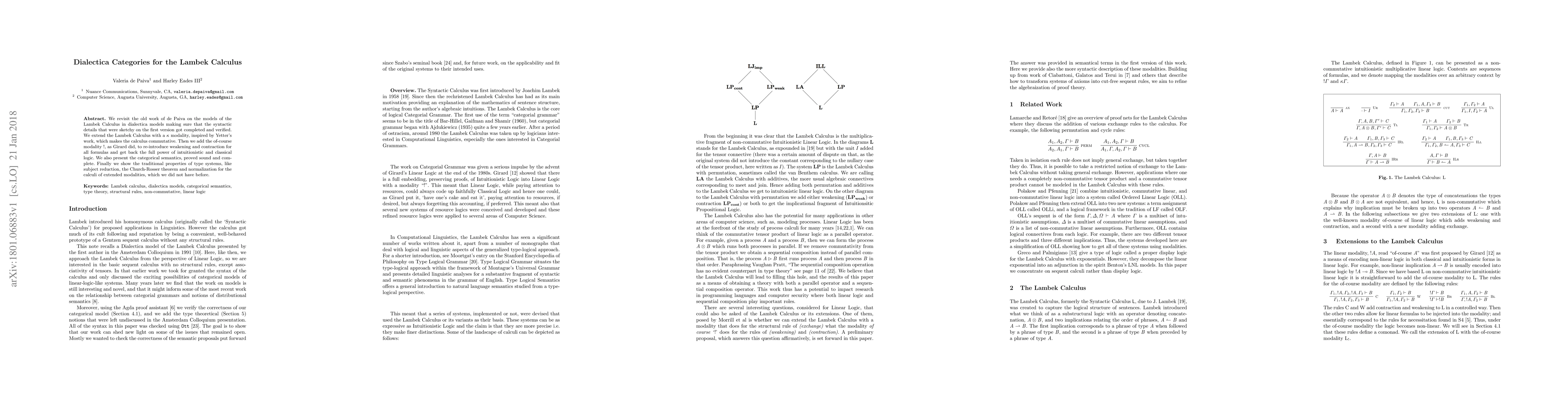 The research revisits de Paiva's work on dialectica models for the Lambek Calculus, completing and verifying syntactic details. It extends the Lambek Calculus with a κ modality inspired by Yetter's work, making it commutative, and adds the of-course modality (!) to reintroduce weakening and contraction for all formulas, returning to the power of intuitionistic and classical logic. Categorical semantics are presented and proven sound and complete, and traditional type system properties like subject reduction, the Church-Rosser theorem, and normalization for extended modalities are demonstrated.