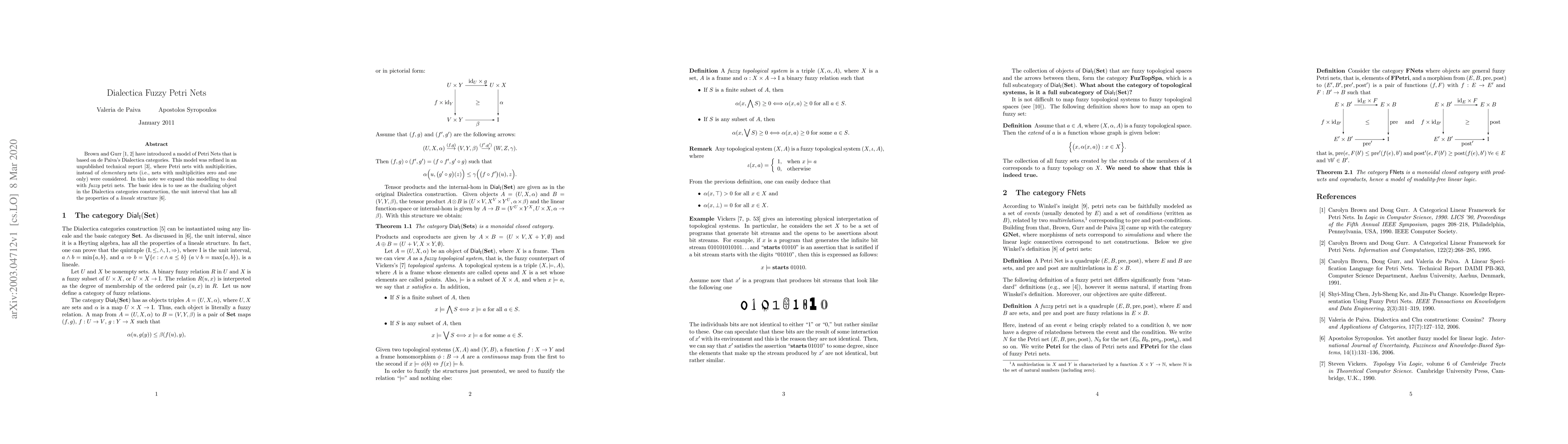 Brown and Gurr have introduced a model of Petri Nets that is based on de~Paiva's Dialectica categories. This model was refined in an unpublished technical report, where Petri nets with multiplicities, instead of {\em elementary} nets (i.e., nets with multiplicities zero and one only) were considered. In this note we expand this modelling to deal with {\em fuzzy} petri nets. The basic idea is to use as the dualizing object in the Dialectica categories construction, the unit interval that has all the properties of a {\em lineale} structure.