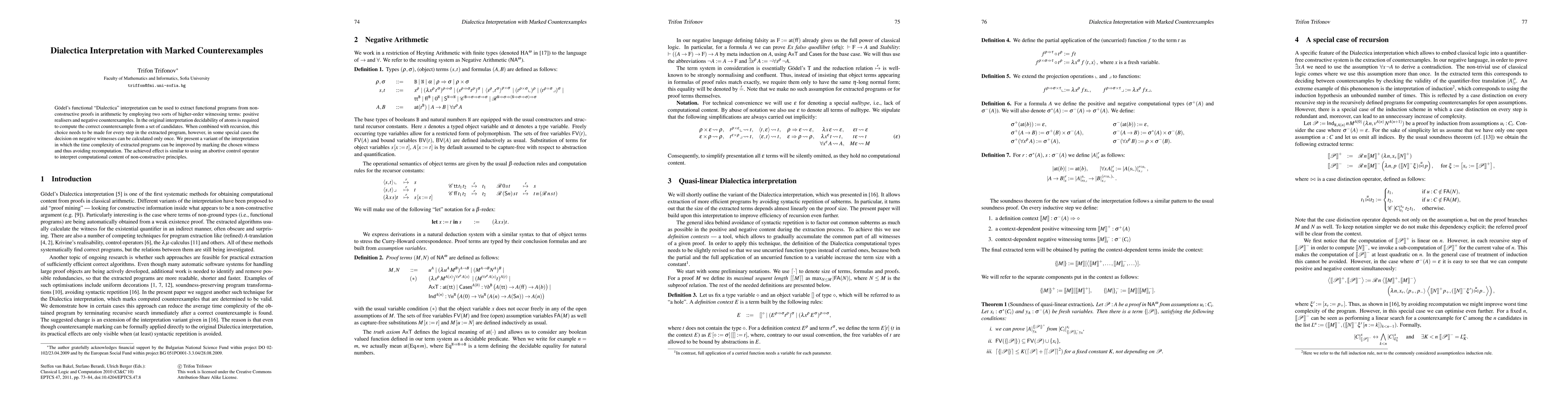 This paper proposes a variant of Goedel's Dialectica interpretation that improves the time complexity of extracted programs by marking chosen negative counterexamples, thereby avoiding recomputation and enhancing efficiency. This approach mimics the use of an abortive control operator in interpreting non-constructive proofs in arithmetic.