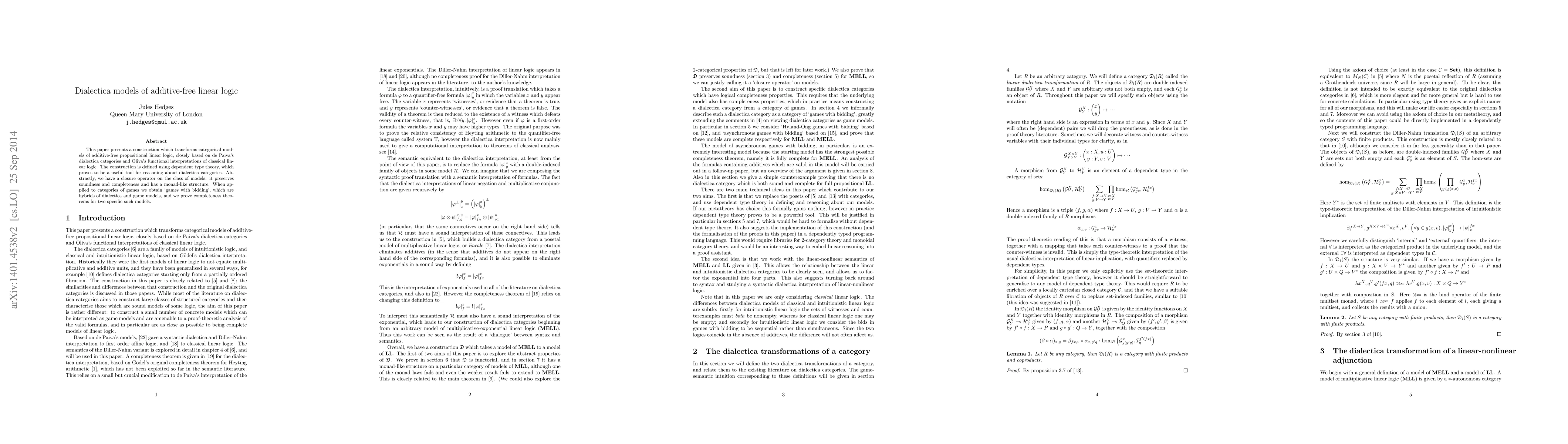 This paper constructs a transformation from categorical models of additive-free linear logic into dialectica categories, leveraging dependent type theory and de Paiva’s dialectica categories. It introduces a closure operator preserving soundness and completeness, and proves completeness theorems for hybrid game models.