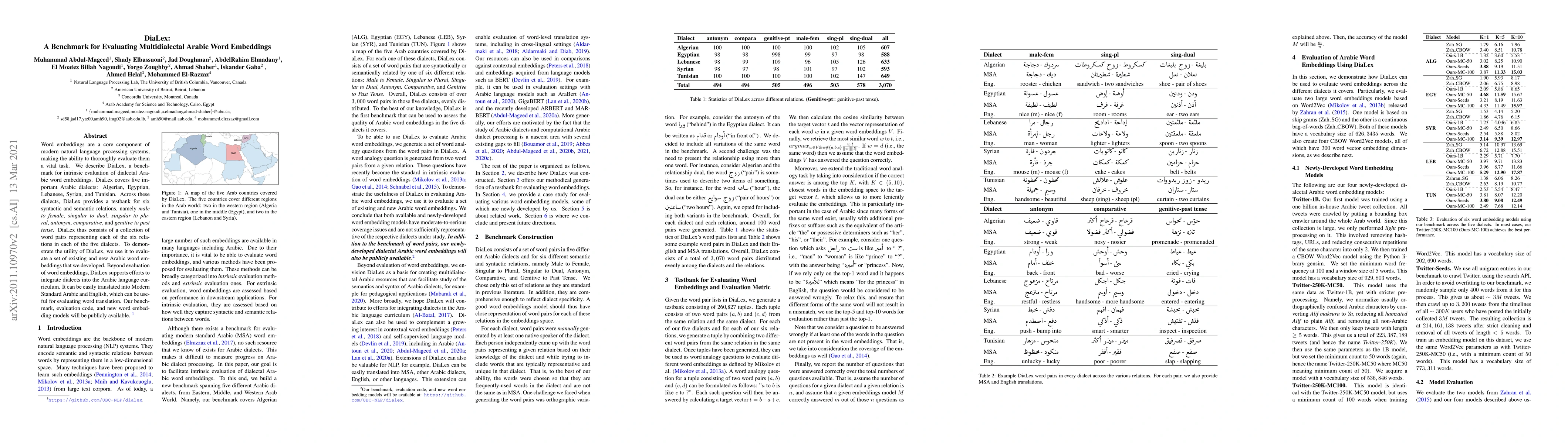 DiaLex is a benchmark for evaluating multidialectal Arabic word embeddings, covering five dialects and six syntactic and semantic relations. It demonstrates the utility of DiaLex by evaluating both existing and newly developed Arabic word embeddings.