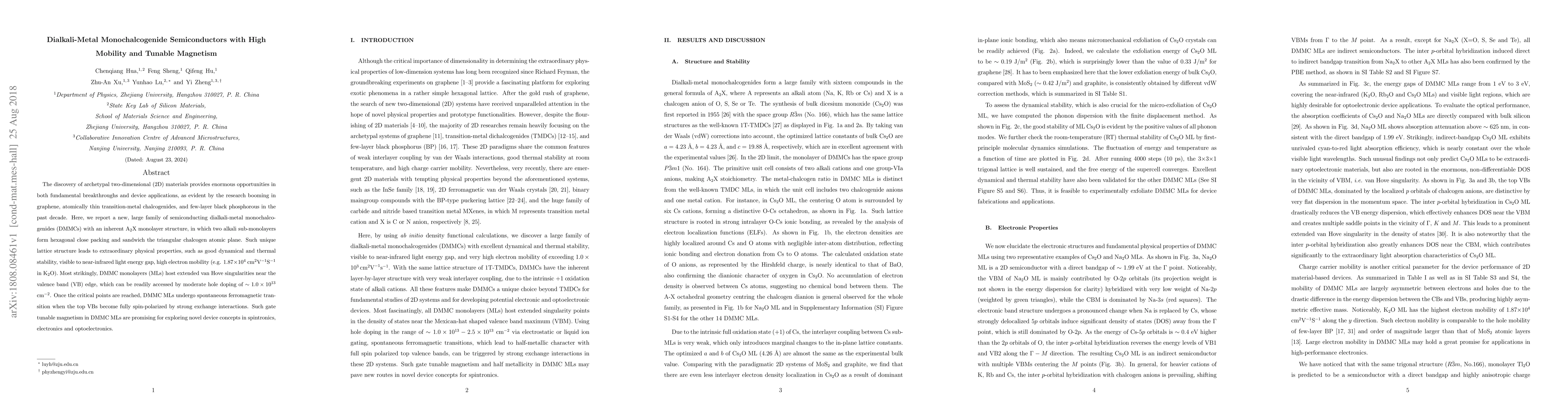 This paper introduces a new class of two-dimensional semiconducting dialkali-metal monochalcogenides (DMMCs) with high electron mobility and tunable magnetism, showing potential for advanced spintronics, electronics, and optoelectronics applications. The unique lattice structure of DMMCs enables spontaneous ferromagnetic transitions under moderate hole doping, making them promising for novel device concepts.