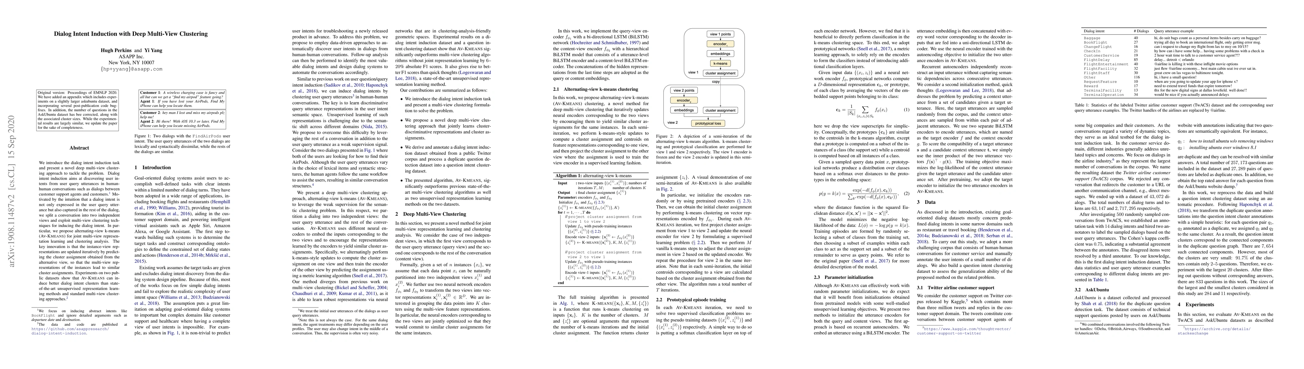 This paper introduces a novel deep multi-view clustering approach called AV-KMEANS for dialog intent induction, which discovers user intents from conversation queries by leveraging both query utterances and the rest of the dialog. Experiments show that AV-KMEANS outperforms existing methods in inducing better dialog intent clusters.