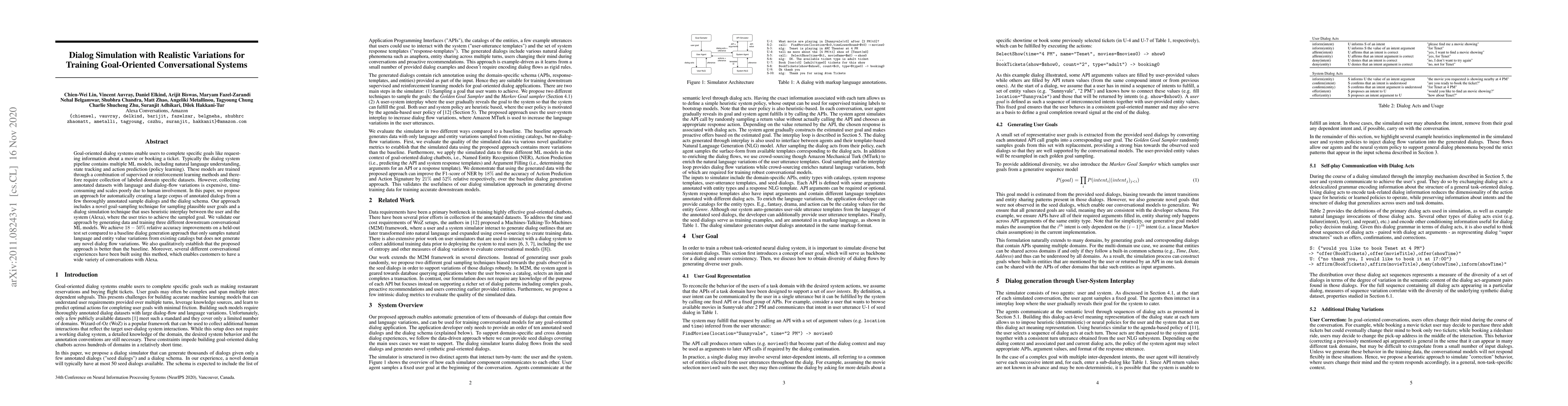 This paper proposes an automated method to generate a large corpus of annotated dialogs for training goal-oriented conversational systems, using a goal-sampling technique and dialog simulation with Alexa. The approach achieves significant relative accuracy improvements and diverse conversational experiences compared to baseline methods.