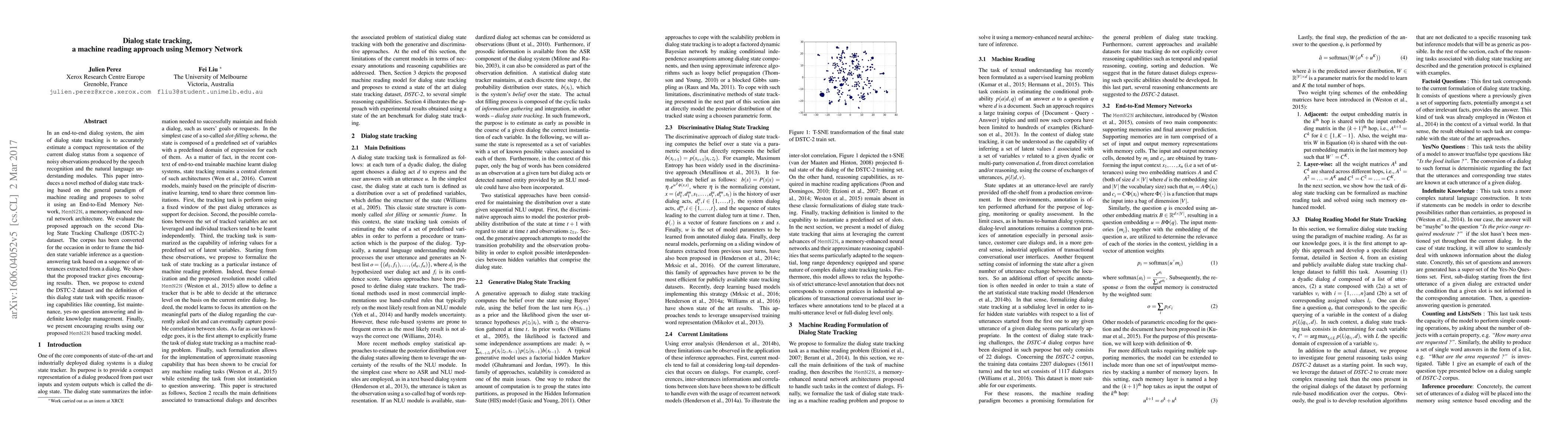 This paper proposes a novel method for dialog state tracking using an End-to-End Memory Network, MemN2N, to accurately infer the current dialog status from noisy observations. The approach is evaluated on the DSTC-2 dataset, showing promising results, and the authors suggest extending the dataset to include more complex reasoning tasks.