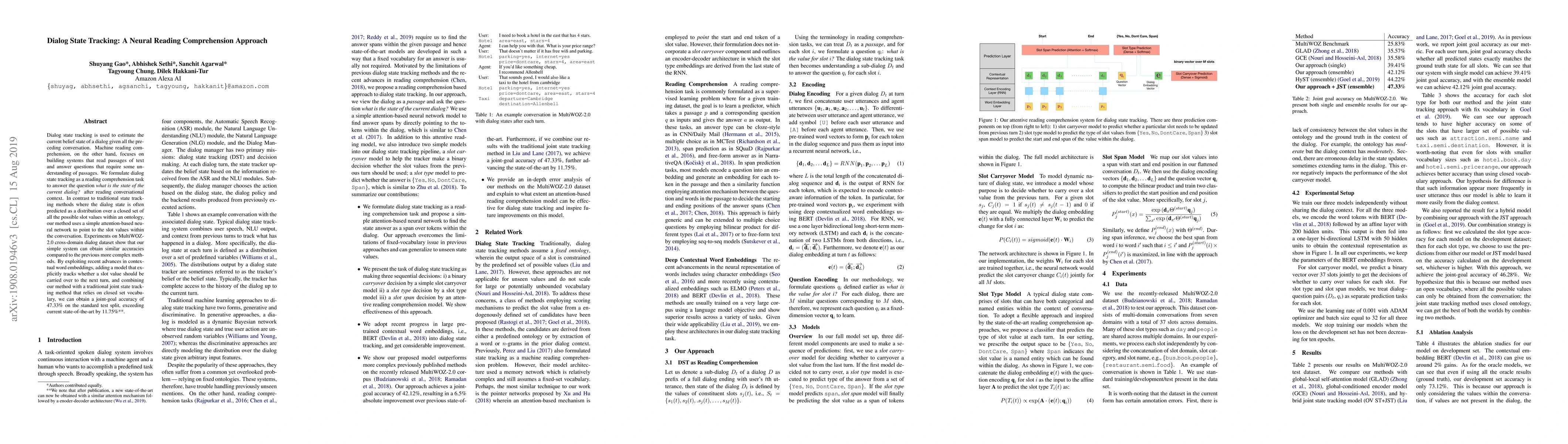 This paper proposes a neural reading comprehension approach for dialog state tracking, using an attention-based neural network to identify slot values within conversational context. The method achieves competitive accuracy compared to complex traditional methods, achieving a joint-goal accuracy of 47.33% on the MultiWOZ-2.0 dataset, surpassing the current state-of-the-art by 11.75%.